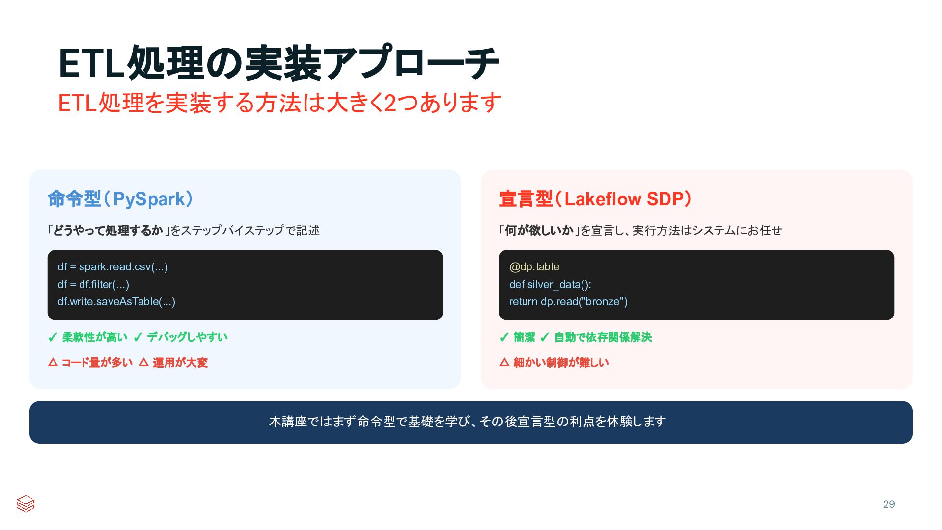 df.filter(...) df.write.saveAsTable(...) ✓ 柔軟性が高い ✓ デバッグしやすい △ コード量が多い △ 運用が大変 宣言型(Lakeflow SDP) 「何が欲しいか」を宣言し、実行方法はシステムにお任せ @dp.table def silver_data(): return dp.read("bronze") ✓ 簡潔 ✓ 自動で依存関係解決 △ 細かい制御が難しい 本講座ではまず命令型で基礎を学び、その後宣言型の利点を体験します