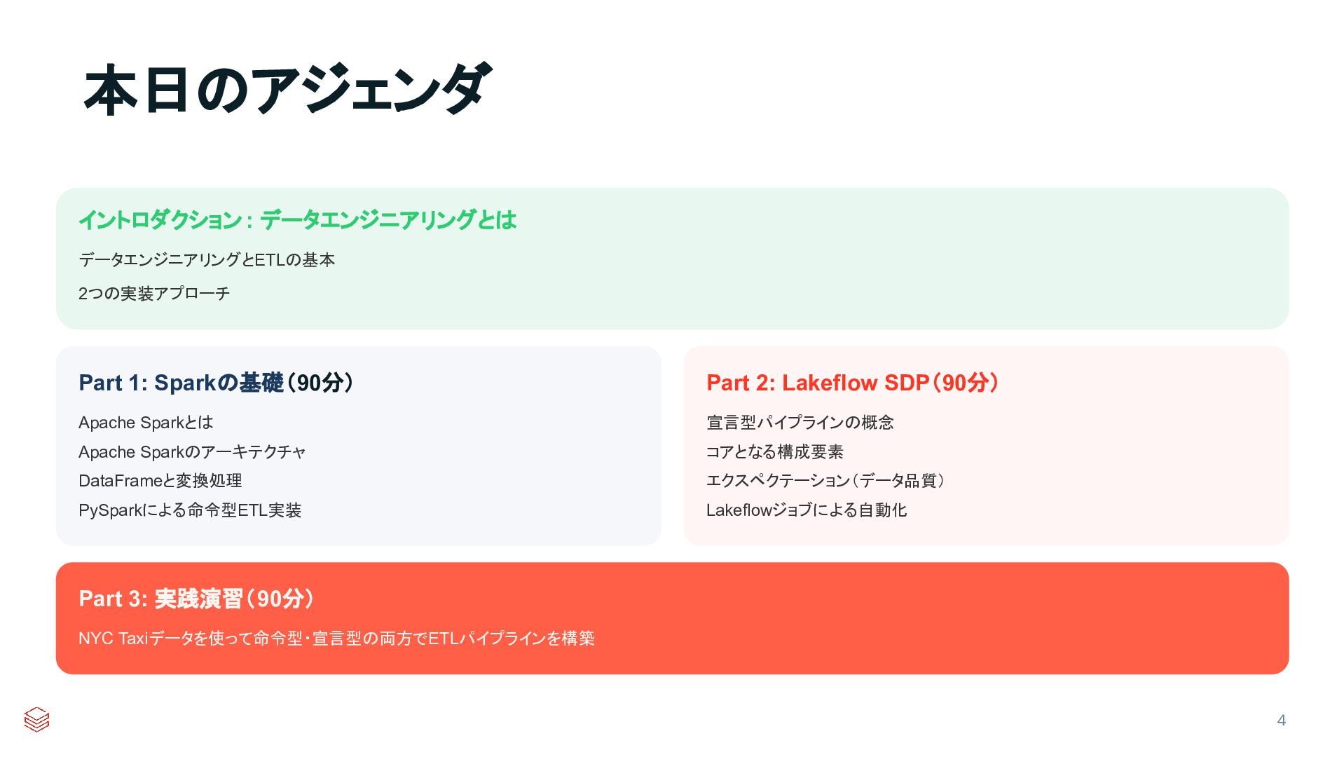 3. Part 1: Sparkの基礎(90分) Apache Sparkとは Apache Sparkのアーキテクチャ DataFrameと変換処理 PySparkによる命令型ETL実装 Part