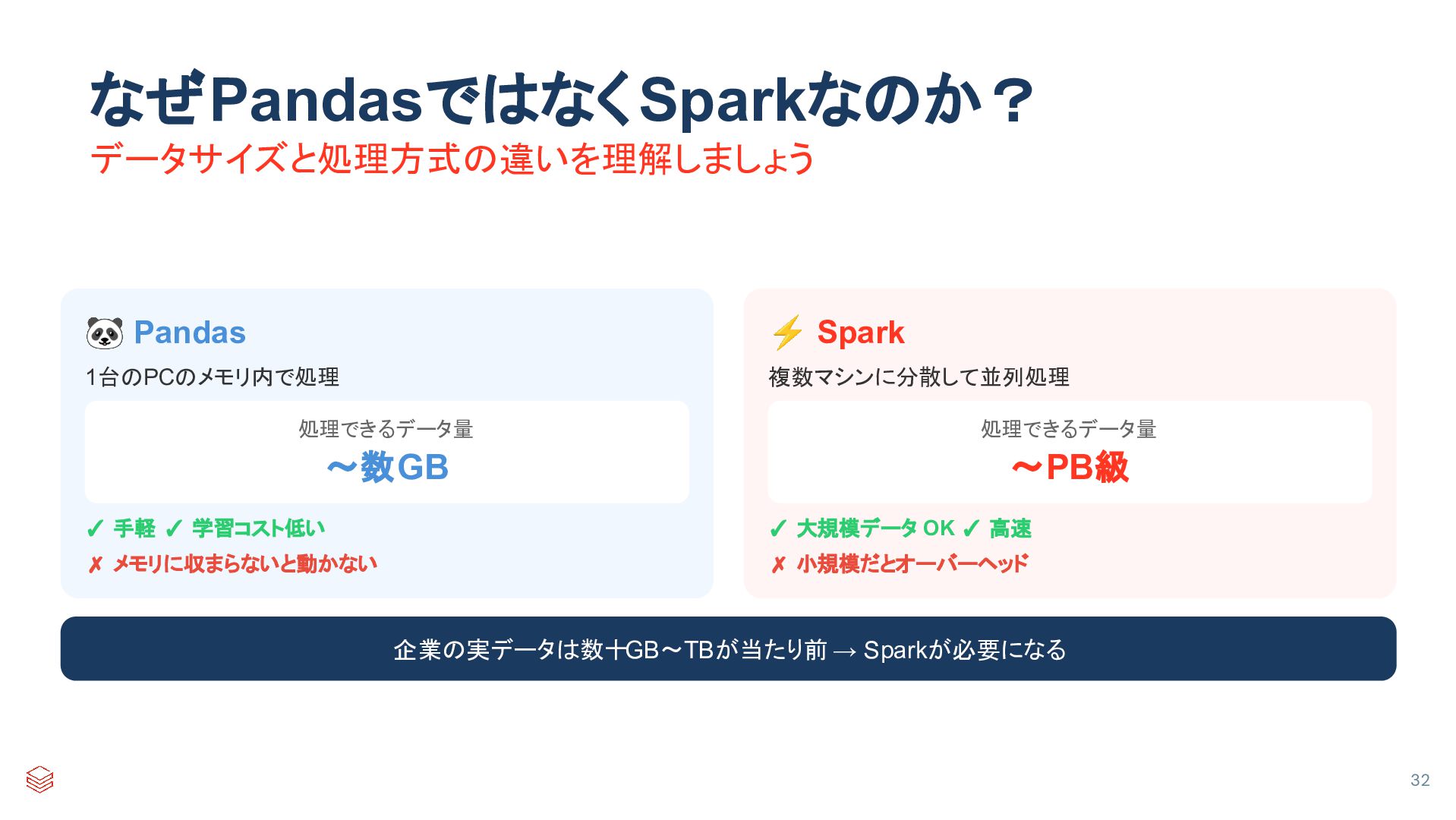 メモリに収まらないと動かない ⚡ Spark 複数マシンに分散して並列処理 処理できるデータ量 〜PB級 ✓ 大規模データ OK ✓ 高速 ✗ 小規模だとオーバーヘッド 企業の実データは数十GB〜TBが当たり前 → Sparkが必要になる なぜPandasではなくSparkなのか? 32 データサイズと処理方式の違いを理解しましょう
