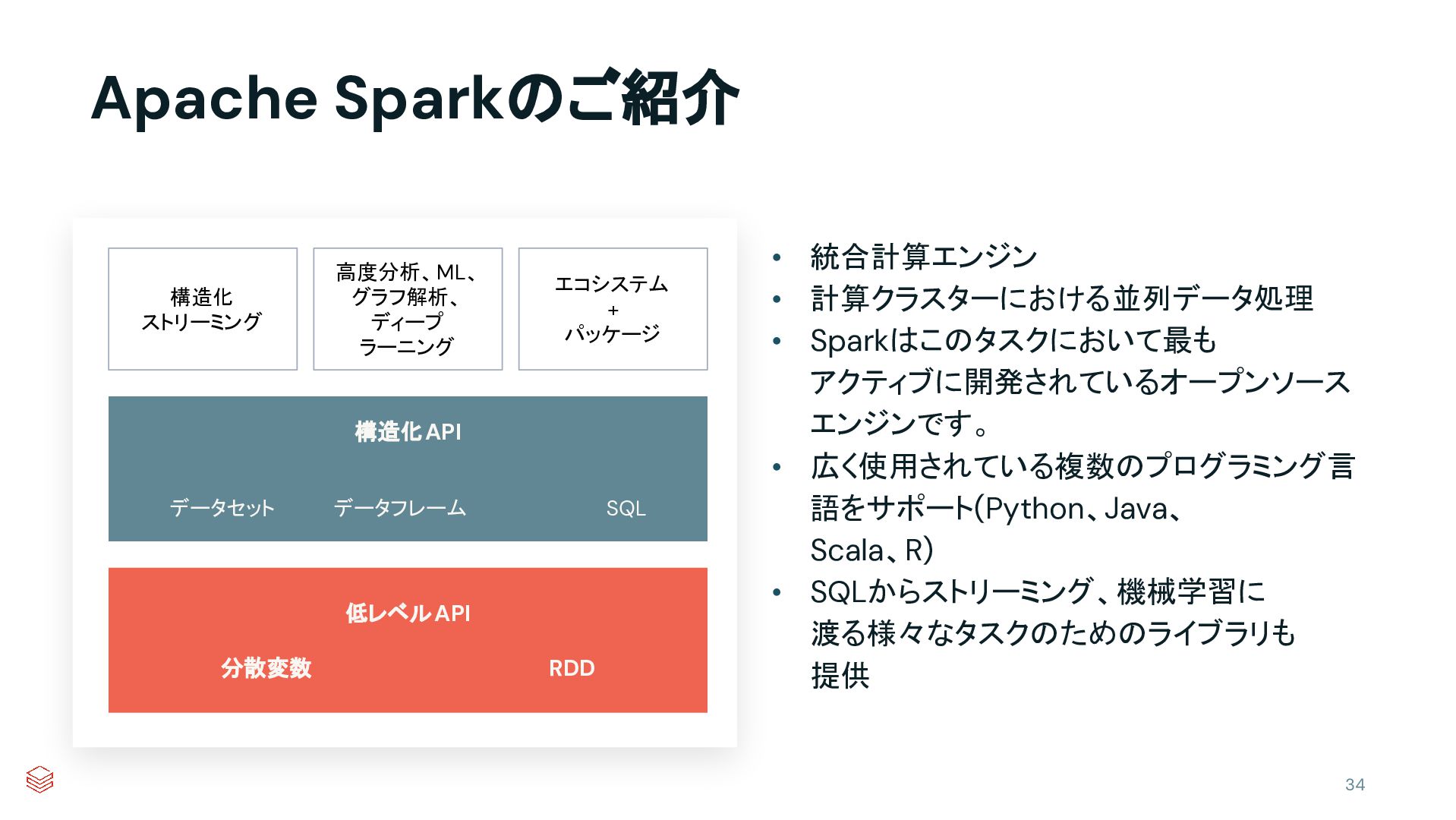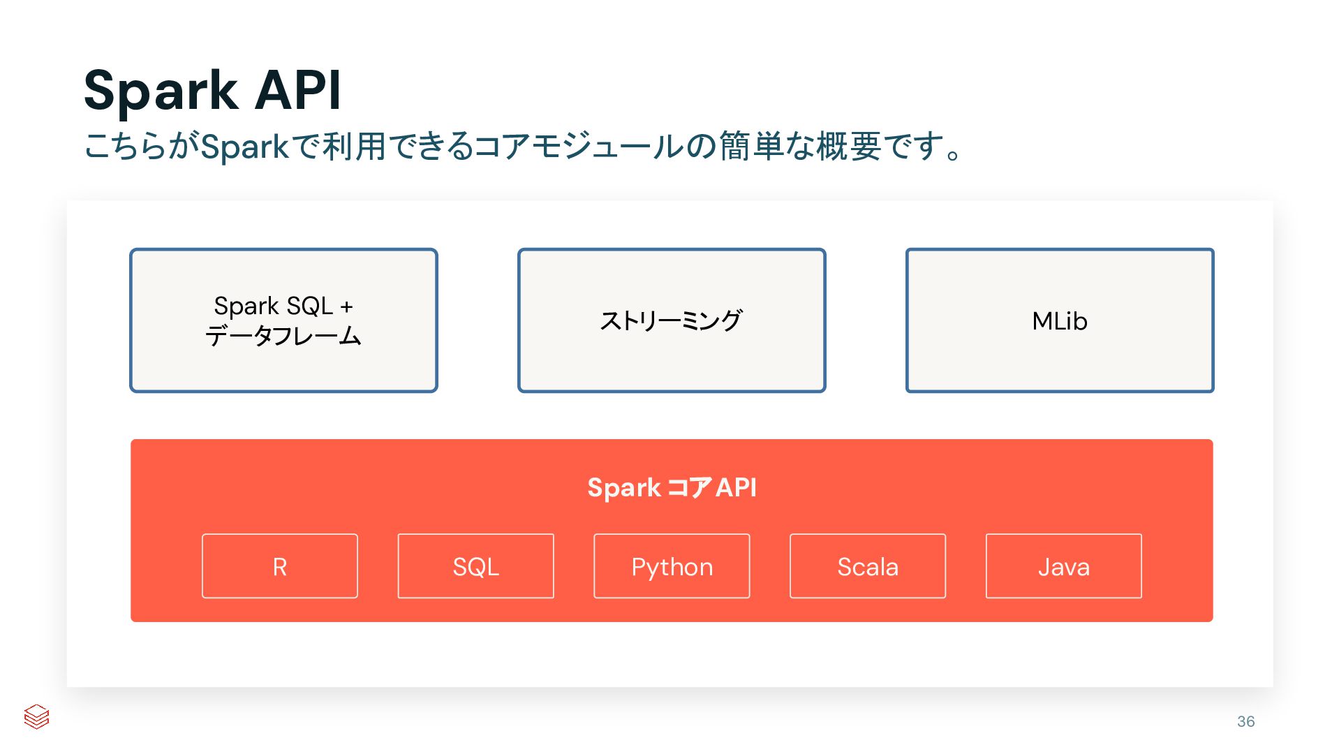 • 広く使用されている複数のプログラミング言 語をサポート(Python、Java、 Scala、R) • SQLからストリーミング、機械学習に 渡る様々なタスクのためのライブラリも 提供 34 構造化 ストリーミング 構造化API データセット データフレーム SQL 高度分析、ML、 グラフ解析、 ディープ ラーニング エコシステム + パッケージ 低レベルAPI 分散変数 RDD