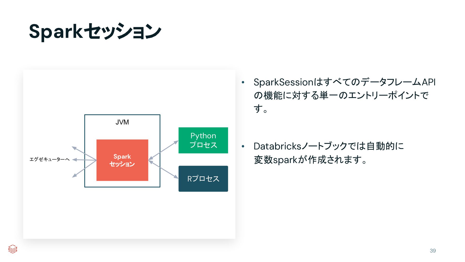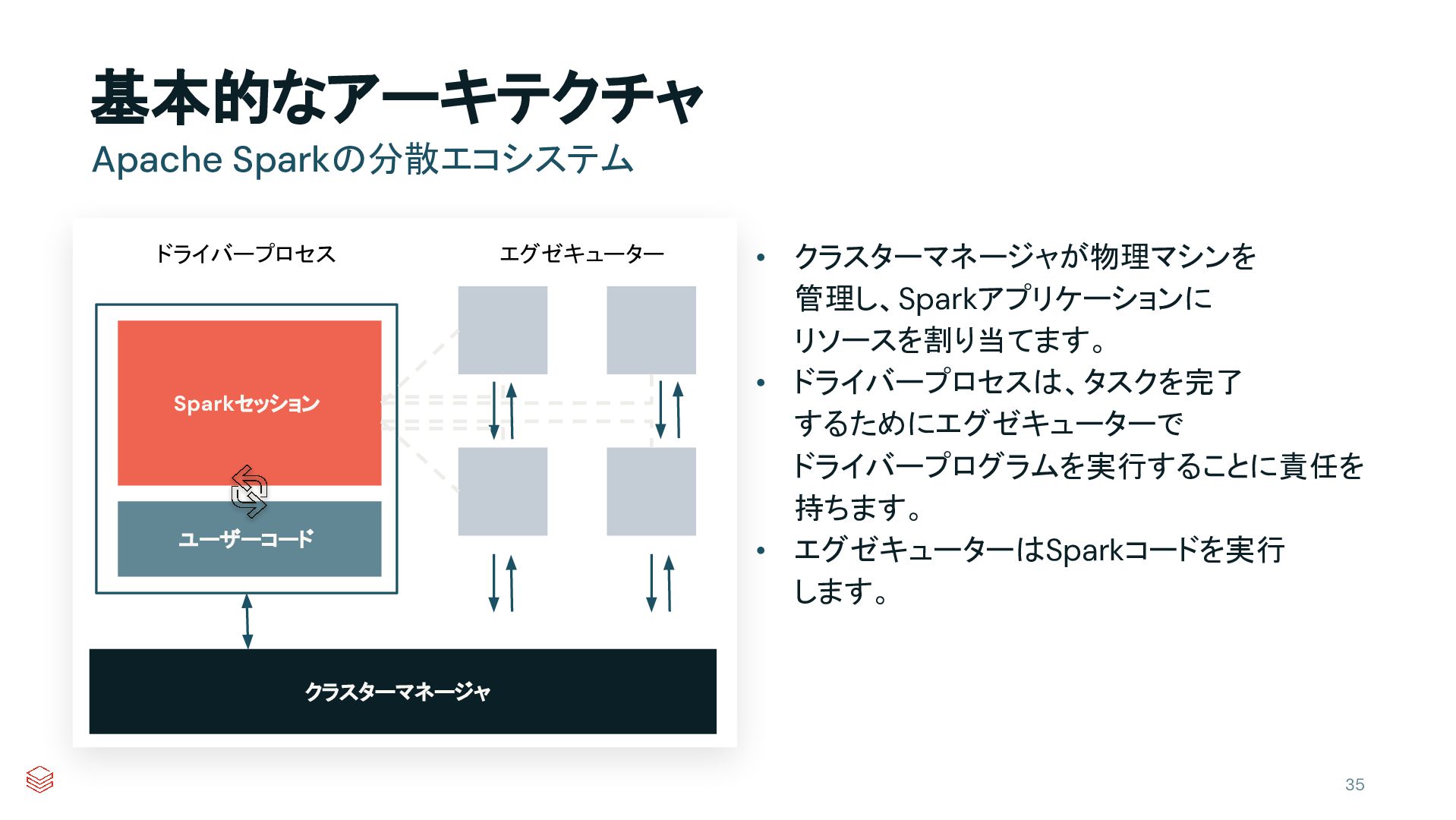 • エグゼキューターはSparkコードを実行 します。 Apache Sparkの分散エコシステム クラスターマネージャ 35 Sparkセッション ユーザーコード ドライバープロセス エグゼキューター