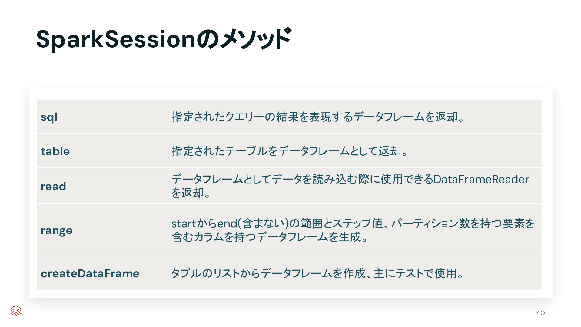 21. SparkSessionのメソッド 40 sql 指定されたクエリーの結果を表現するデータフレームを返却。 table 指定されたテーブルをデータフレームとして返却。 read データフレームとしてデータを読み込む際に使用できるDataFrameReader を返却。 range