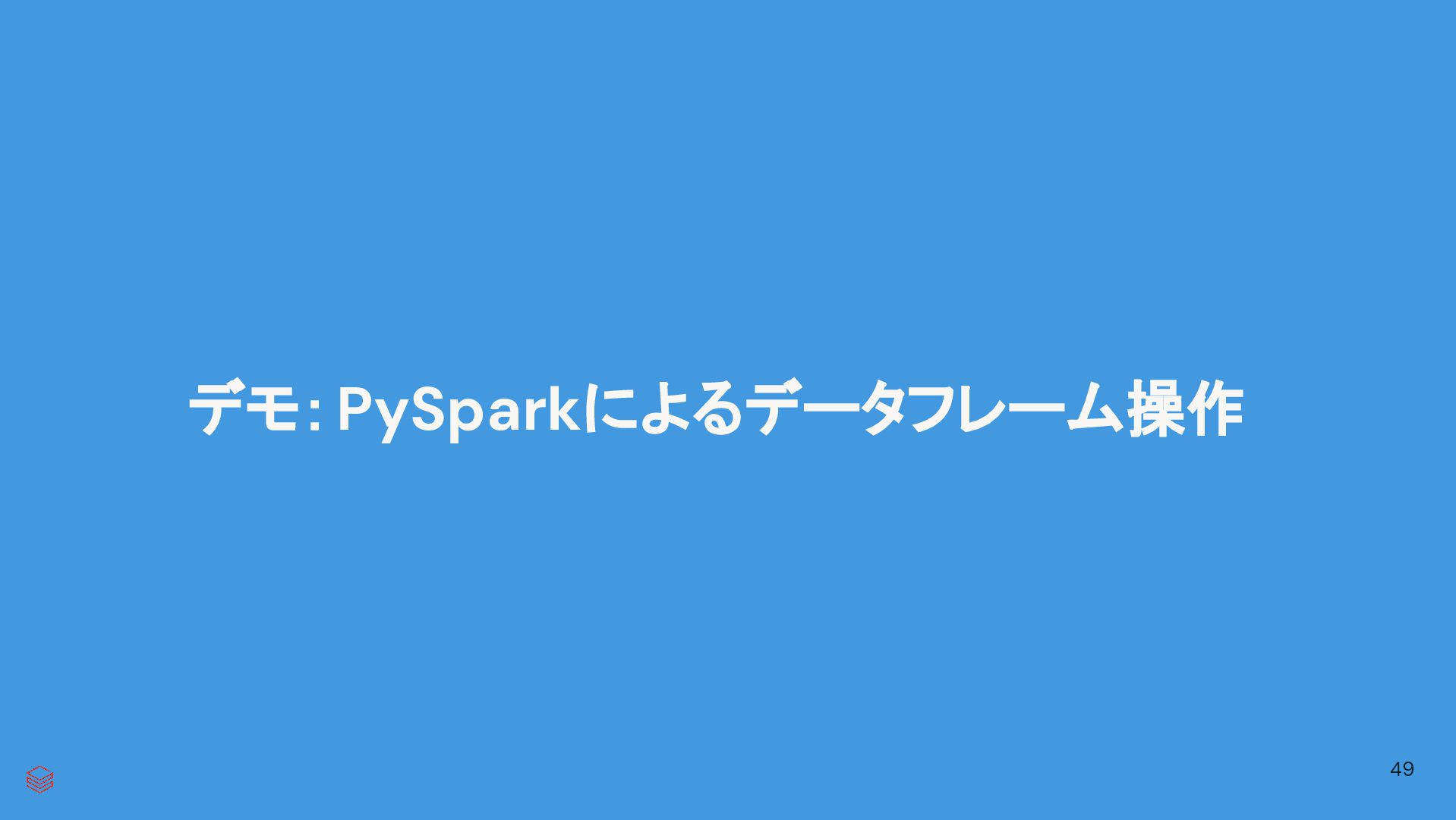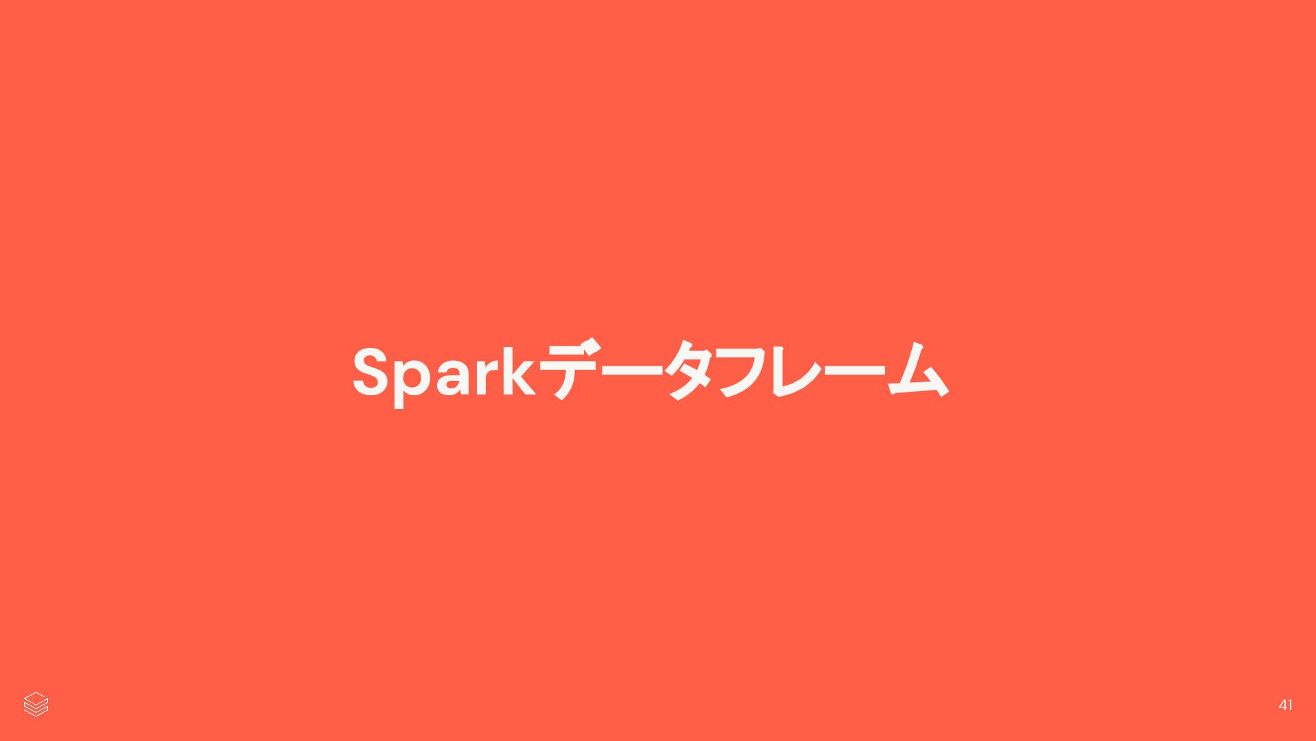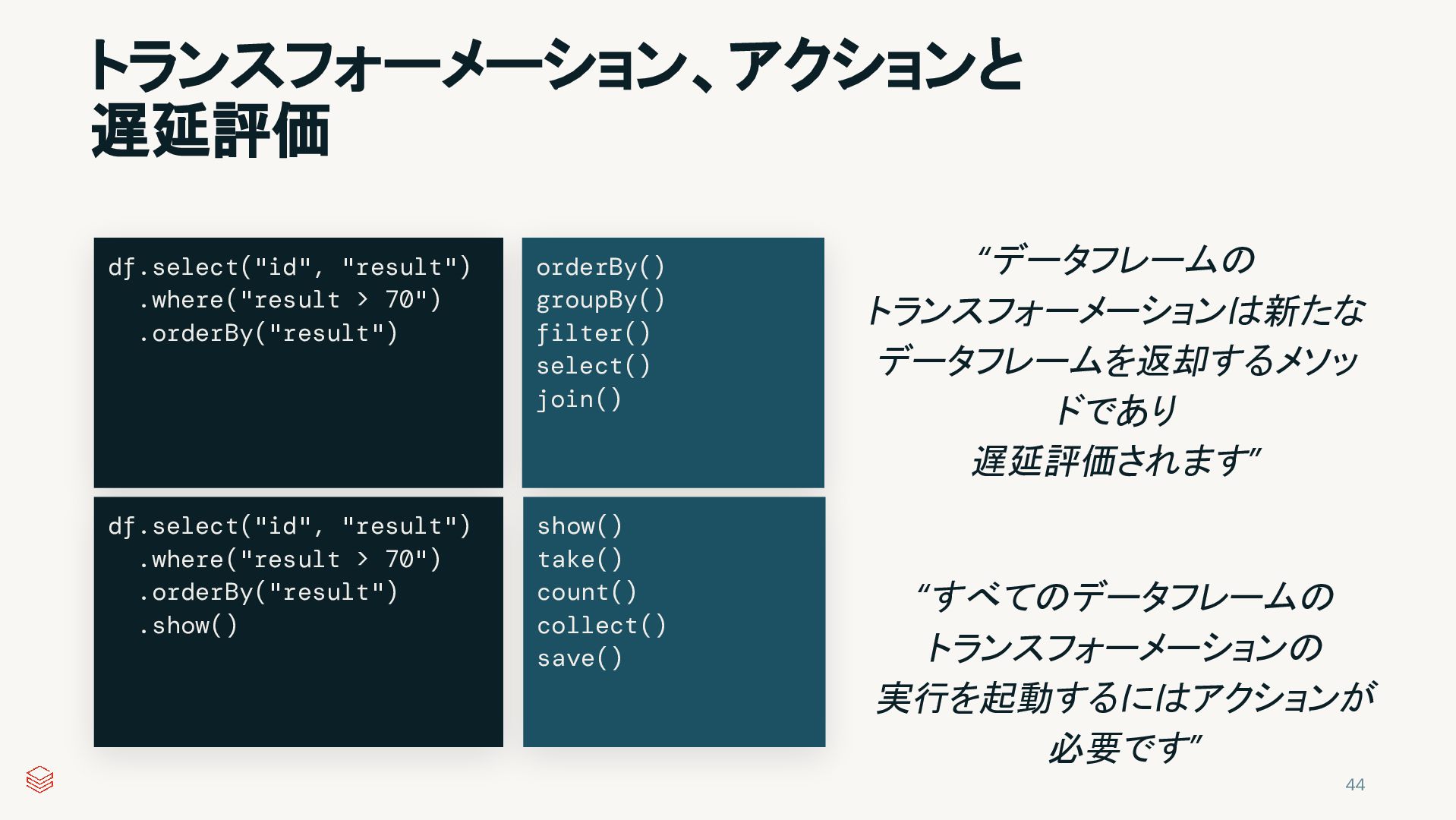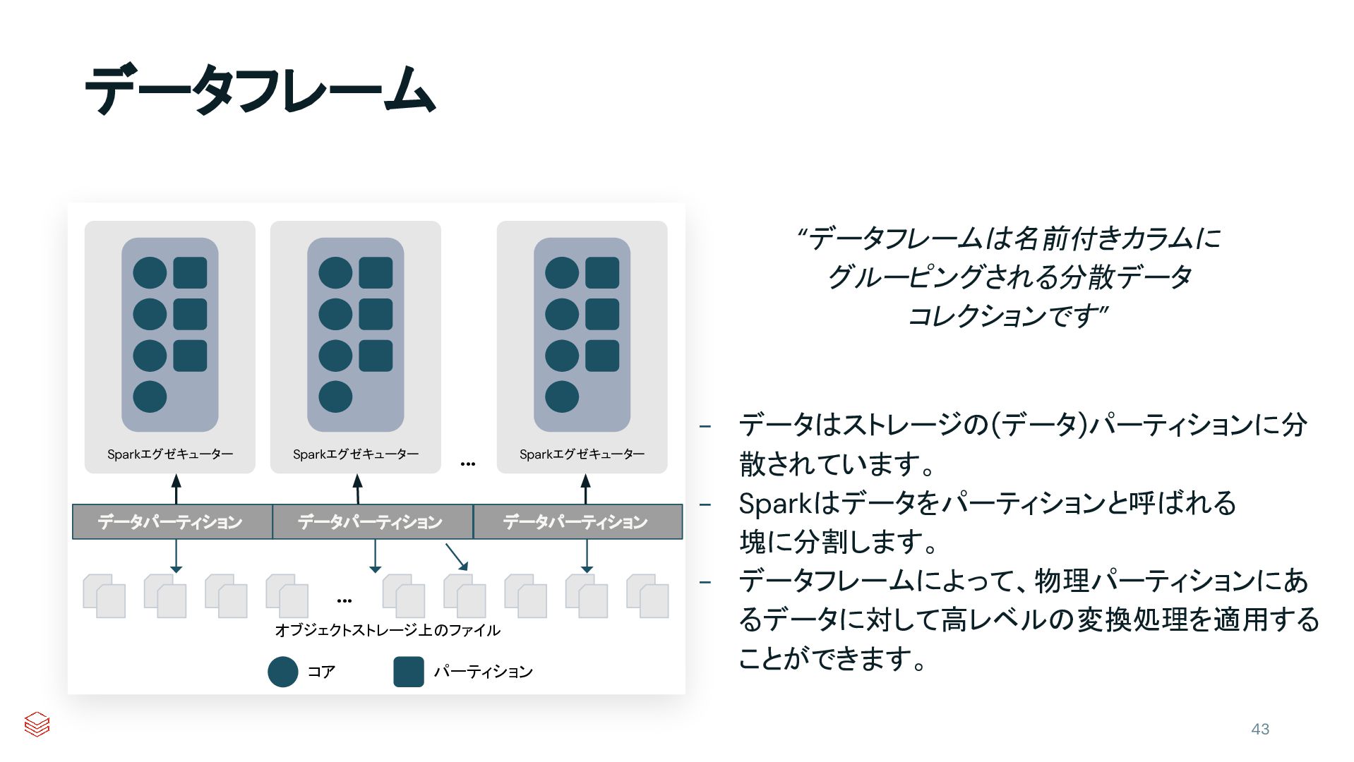 - データフレームによって、物理パーティションにあ るデータに対して高レベルの変換処理を適用する ことができます。 43 オブジェクトストレージ上のファイル データパーティション データパーティション データパーティション Sparkエグゼキューター Sparkエグゼキューター Sparkエグゼキューター ... コア パーティション ...