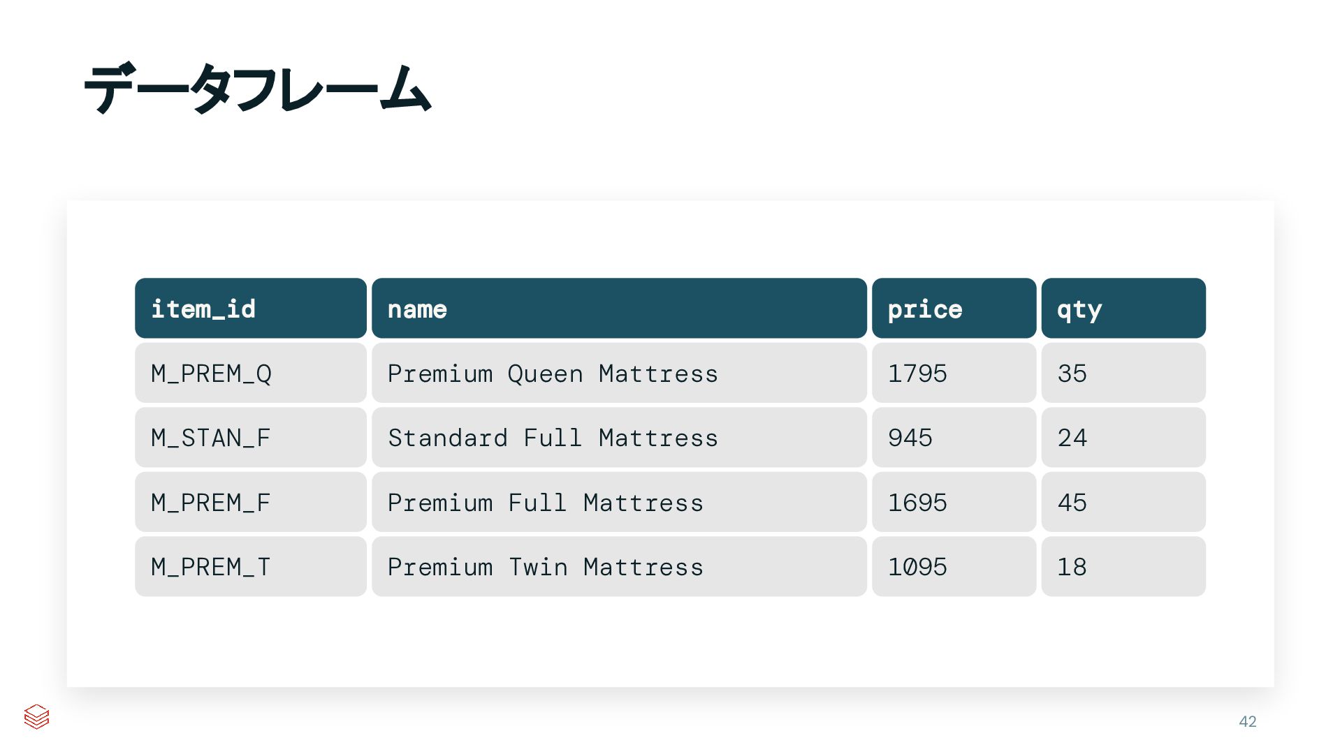 22. データフレーム 42 item_id name price M_PREM_Q Premium Queen Mattress 1795
