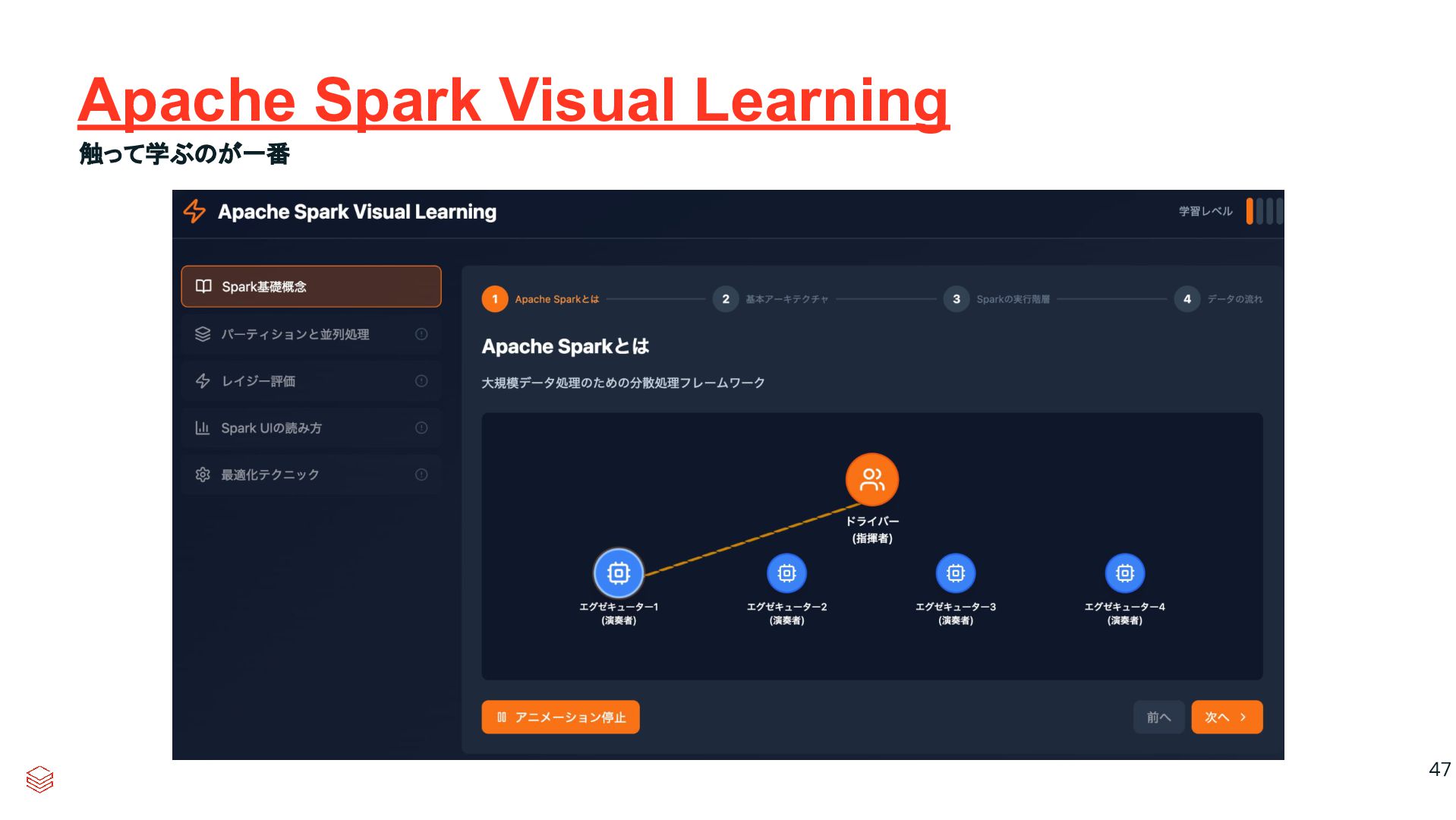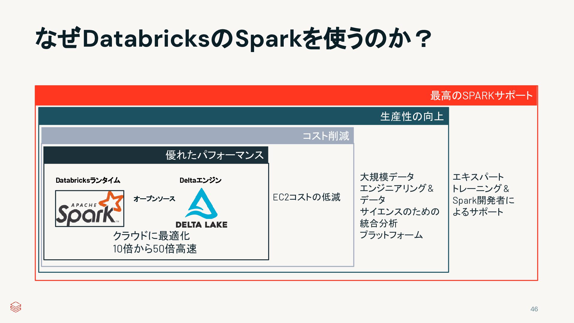 25. なぜDatabricksのSparkを使うのか? 46 EC2コストの低減 オープンソース 生産性の向上 大規模データ エンジニアリング & データ サイエンスのための