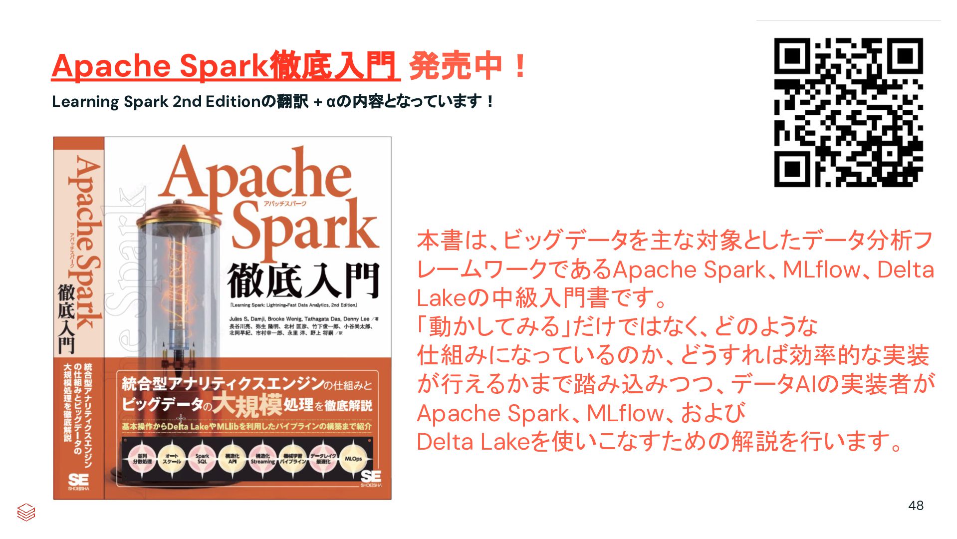レームワークであるApache Spark、MLflow、Delta Lakeの中級入門書です。 「動かしてみる」だけではなく、どのような 仕組みになっているのか、どうすれば効率的な実装 が行えるかまで踏み込みつつ、データAIの実装者が Apache Spark、MLflow、および Delta Lakeを使いこなすための解説を行います。 48