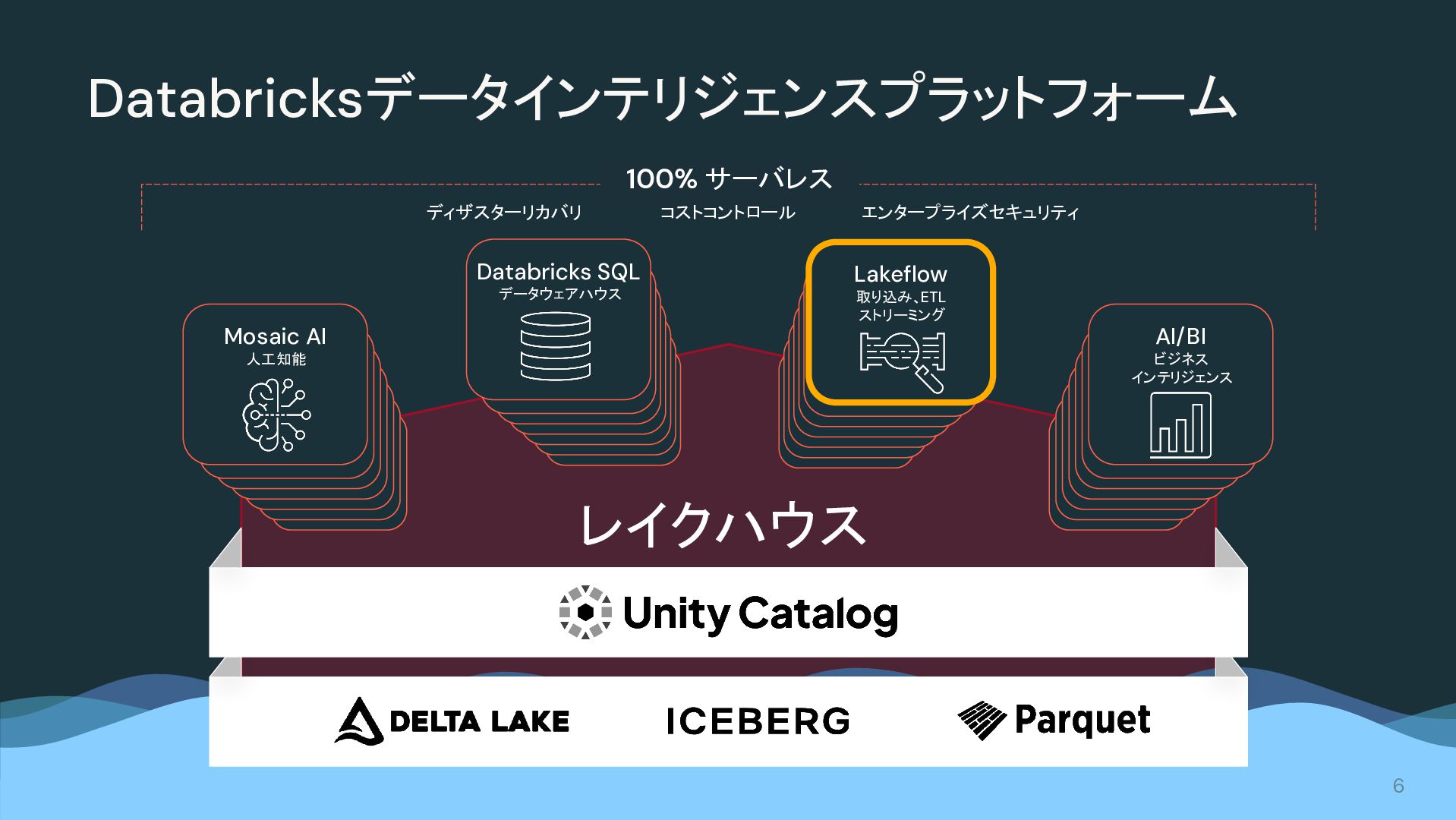 SQL データウェアハウス Lakeflow 取り込み、ETL ストリーミング Mosaic AI 人工知能 Databricksデータインテリジェンスプラットフォーム 6