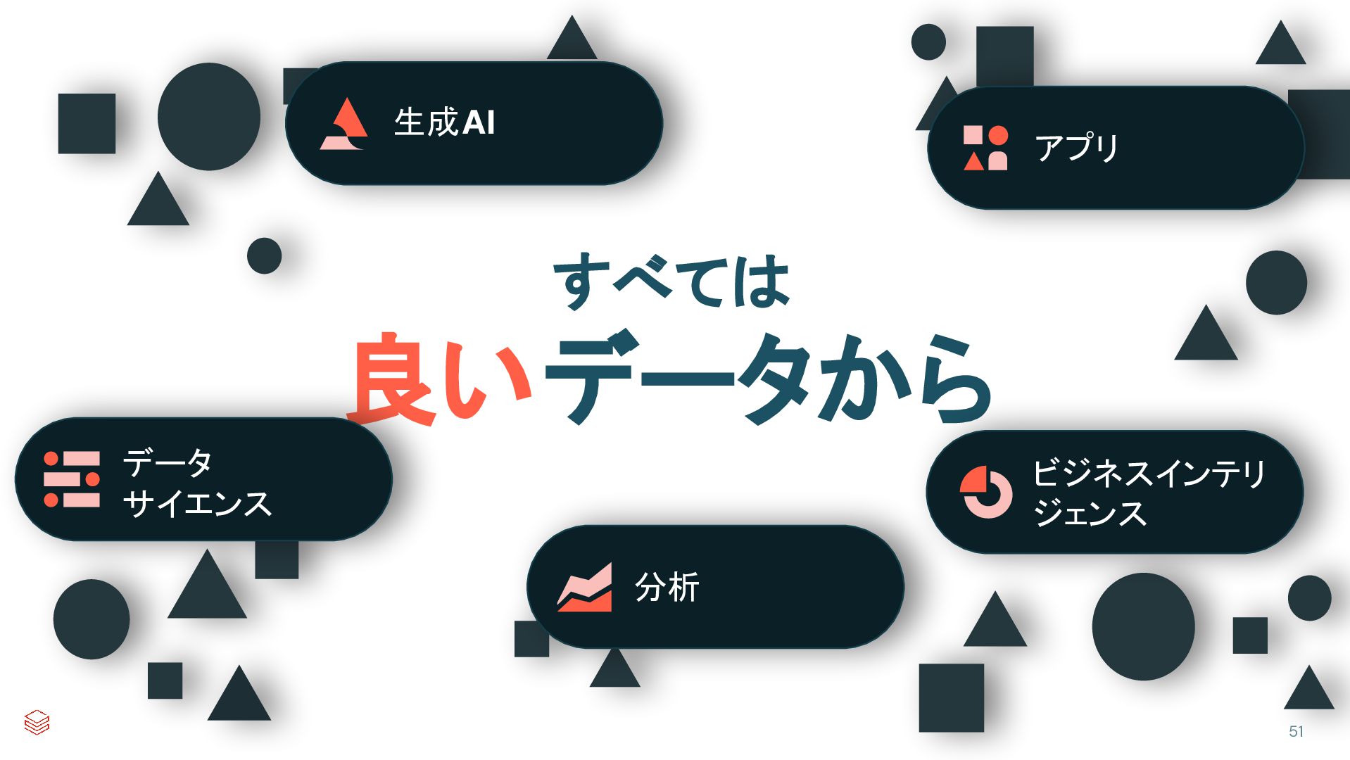 データサイエンス & 生成AI 処理、ETL、リアルタイム分析 オーケストレーション データとAIのガバナンス バッチ & ストリーム データウェアハウス データインテリジェンスエンジン データインテリジェンスプラットフォーム フェデレーショ ン ETL AIアプリ 3rd party ビジネスアプリ 連携 取り込み 変換 分析 ソース サービング クエリーと処理 ダッシュボード Spark / Photon Delta Live Tables Databricks SQL ワークフロー Auto loader マーケットプ レース アシスタント データ ルーム AI/BI レイクハウスモ ニタリング Hugging Face OpenAI IDプロバイダ ガバナンス AIサービス モデル サービング Vector Search ML モデリング Mosaic AI カタログ & リ ネージ アクセス 制御 Unity Catalog MLOps 生成AI 特徴量 サービング … ドメイン 鍵管理 鍵 モデル / 特徴量 DatabricksIQ センサーとIoT (非構造化) RDBMS (構造化) ビジネスアプリ (非構造化) メディア (非構造化) 他のクラウド ビジネスアプリ ファイル / ログ (半構造化) IDプロバイダ エンタープライズカ タログ クラウドストレージ AIアプリ RDBMS (構造化) 取り込み ツール イベント ストリーミング RDBM, KVストア データ利用 BIツール Delta Lake Delta Sharing bronze silver gold 16
