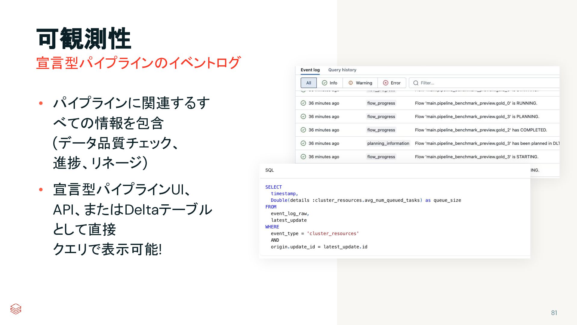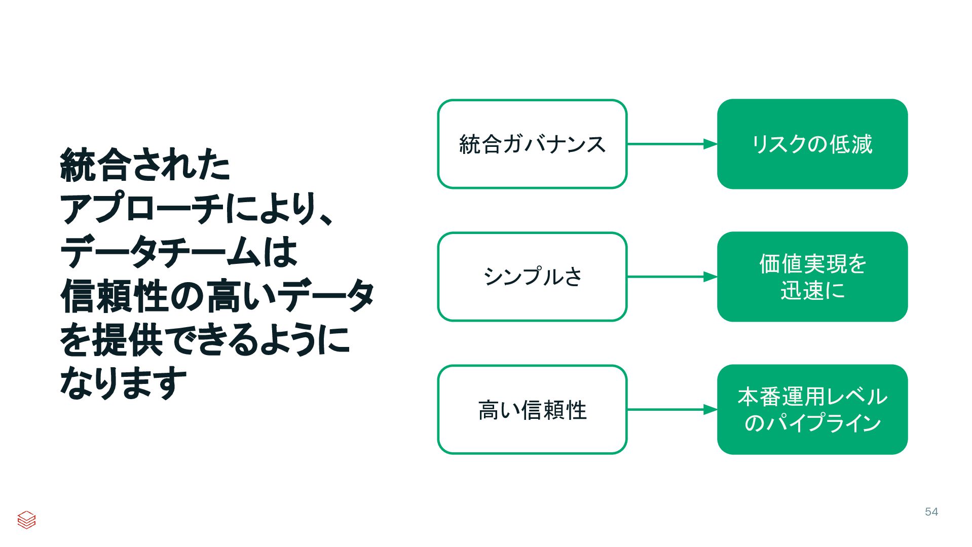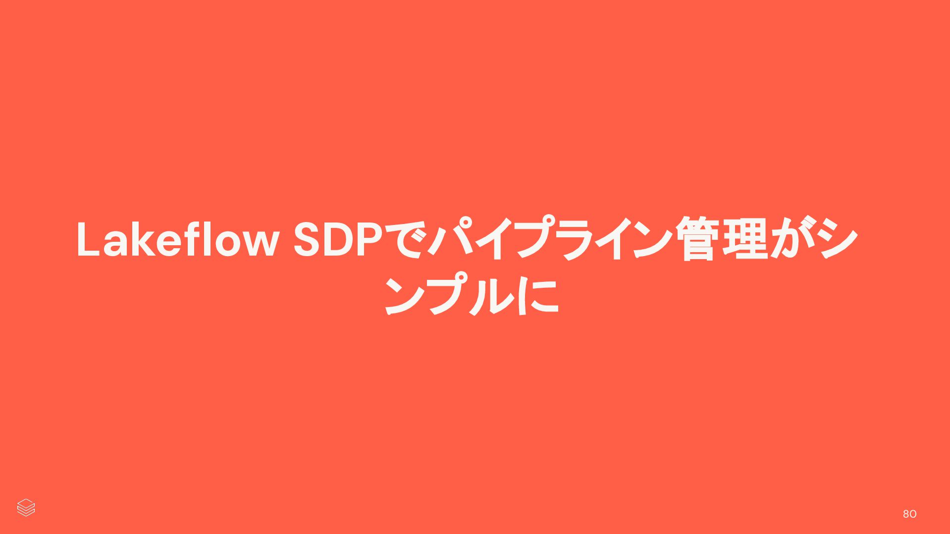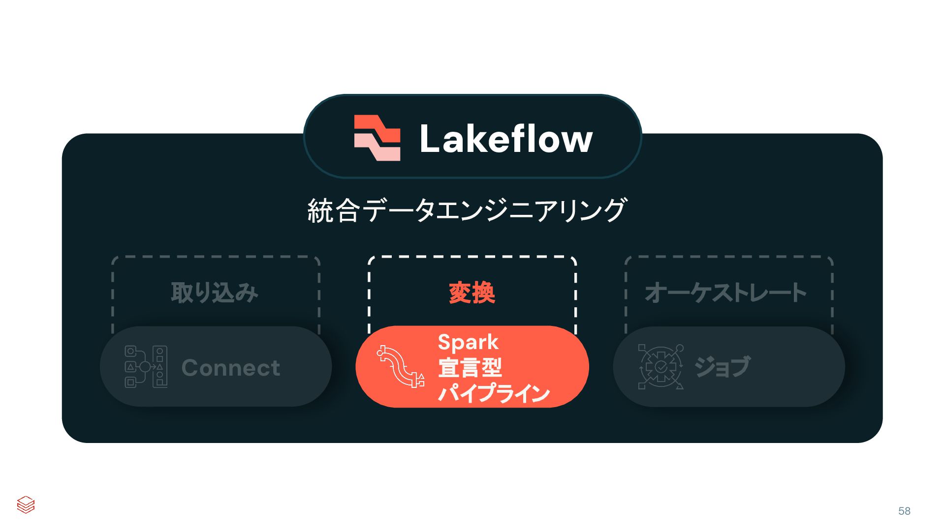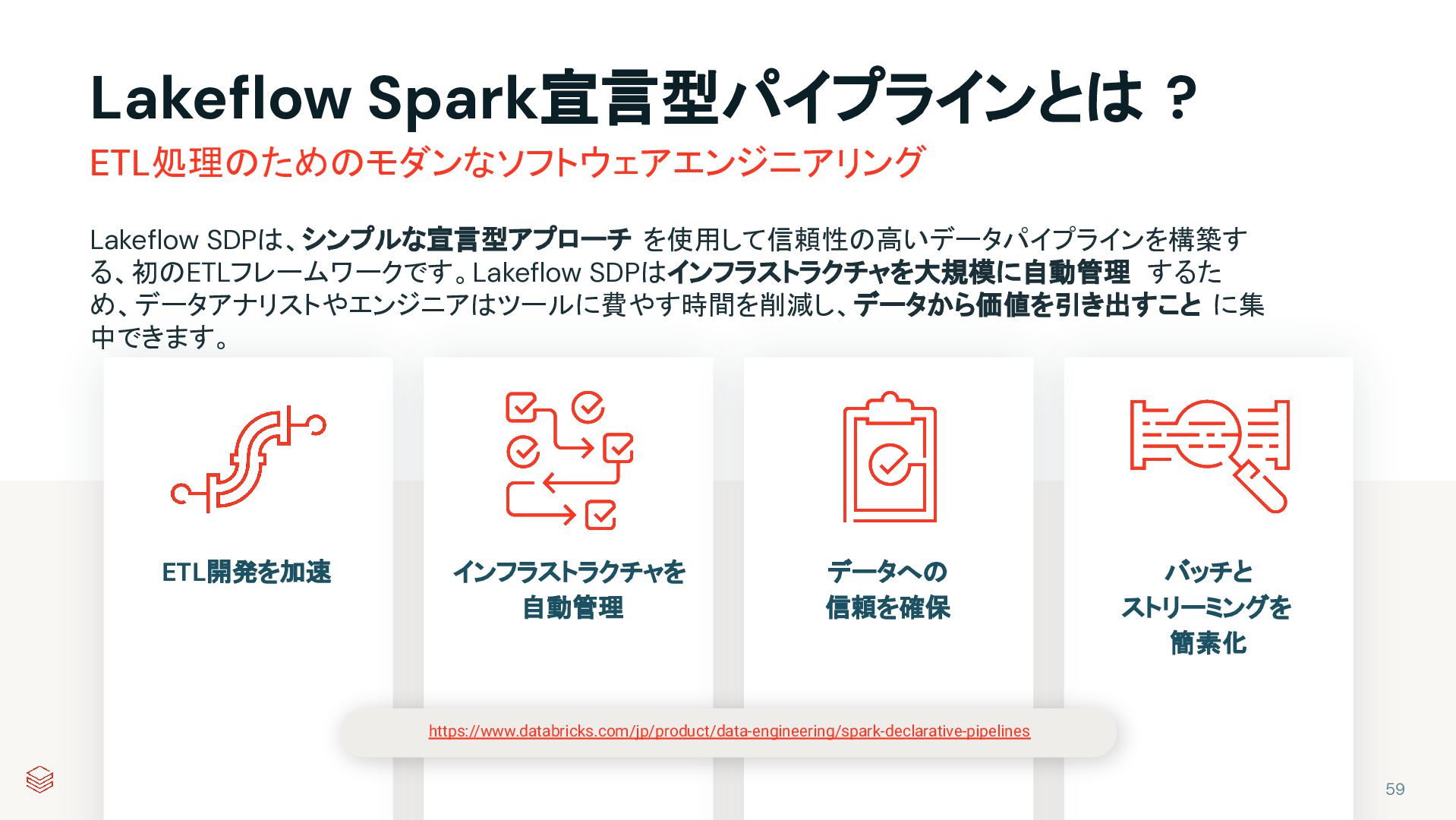 め、データアナリストやエンジニアはツールに費やす時間を削減し、データから価値を引き出すこと に集 中できます。 ETL開発を加速 インフラストラクチャを 自動管理 データへの 信頼を確保 バッチと ストリーミングを 簡素化 https://www.databricks.com/jp/product/data-engineering/spark-declarative-pipelines 59