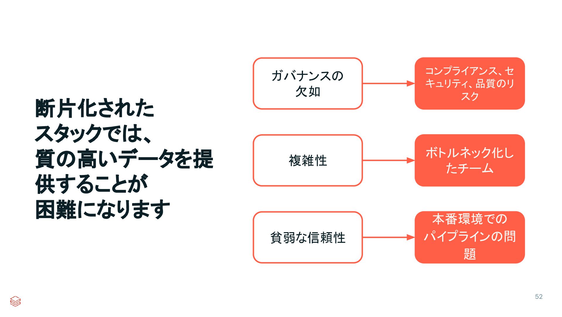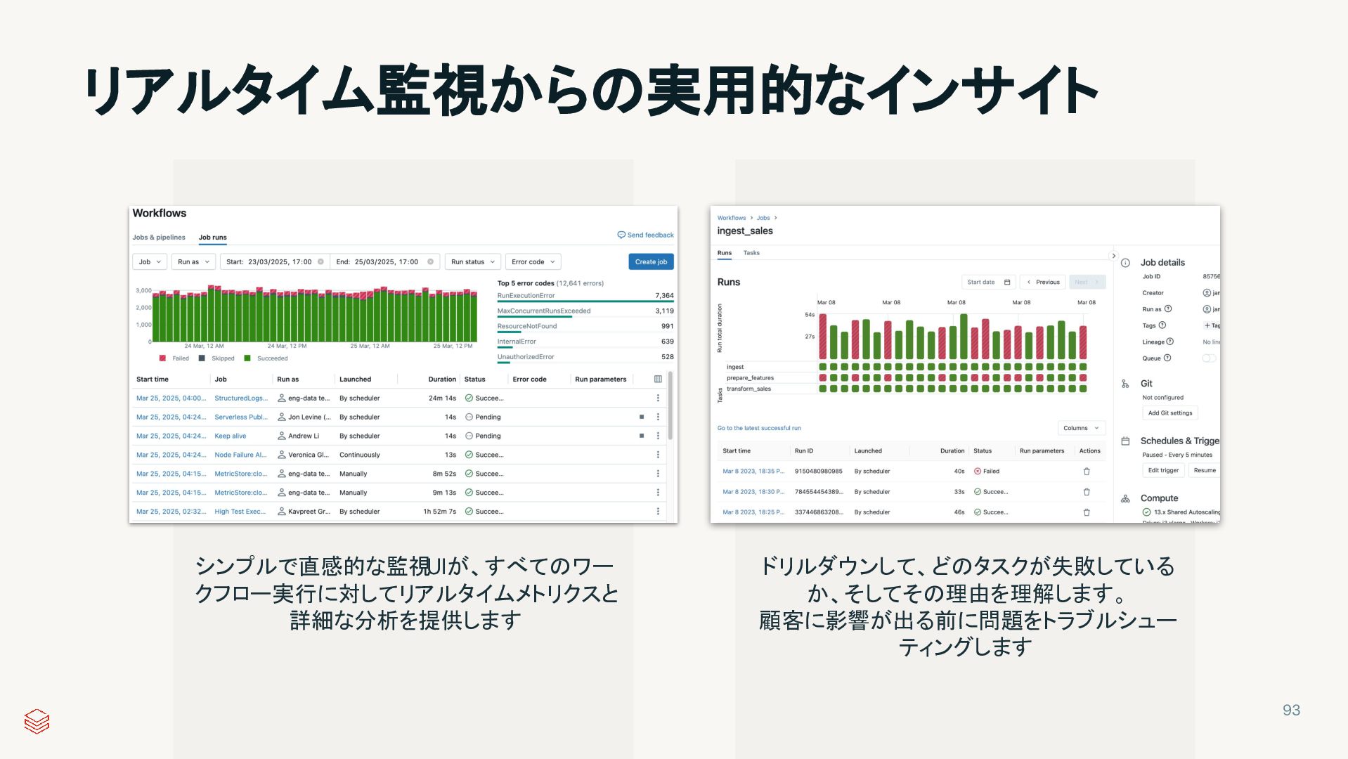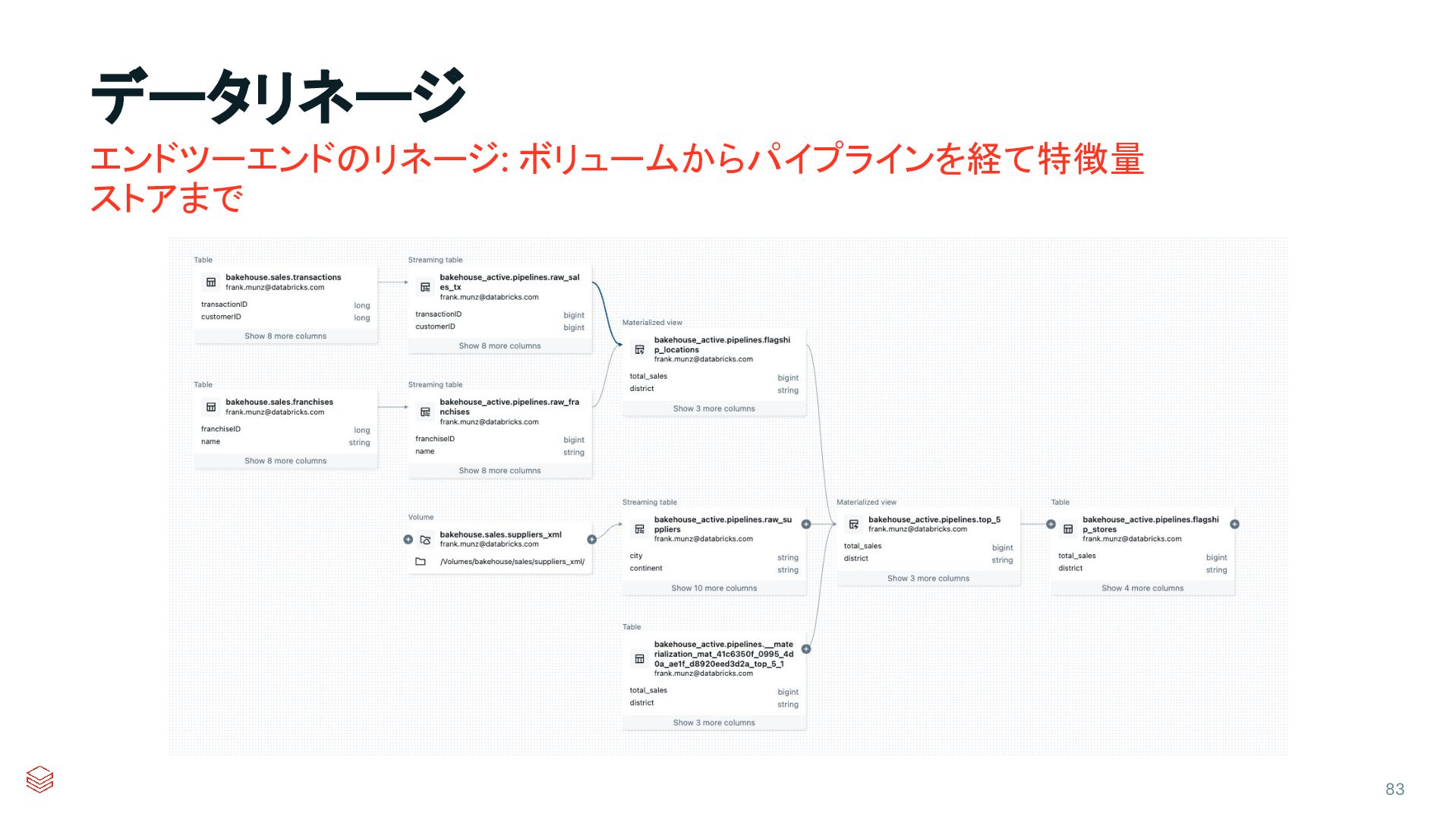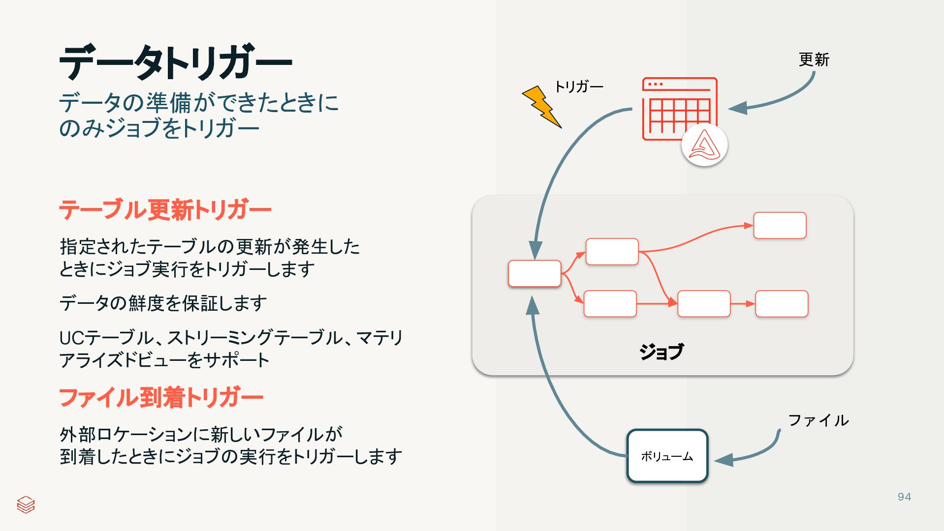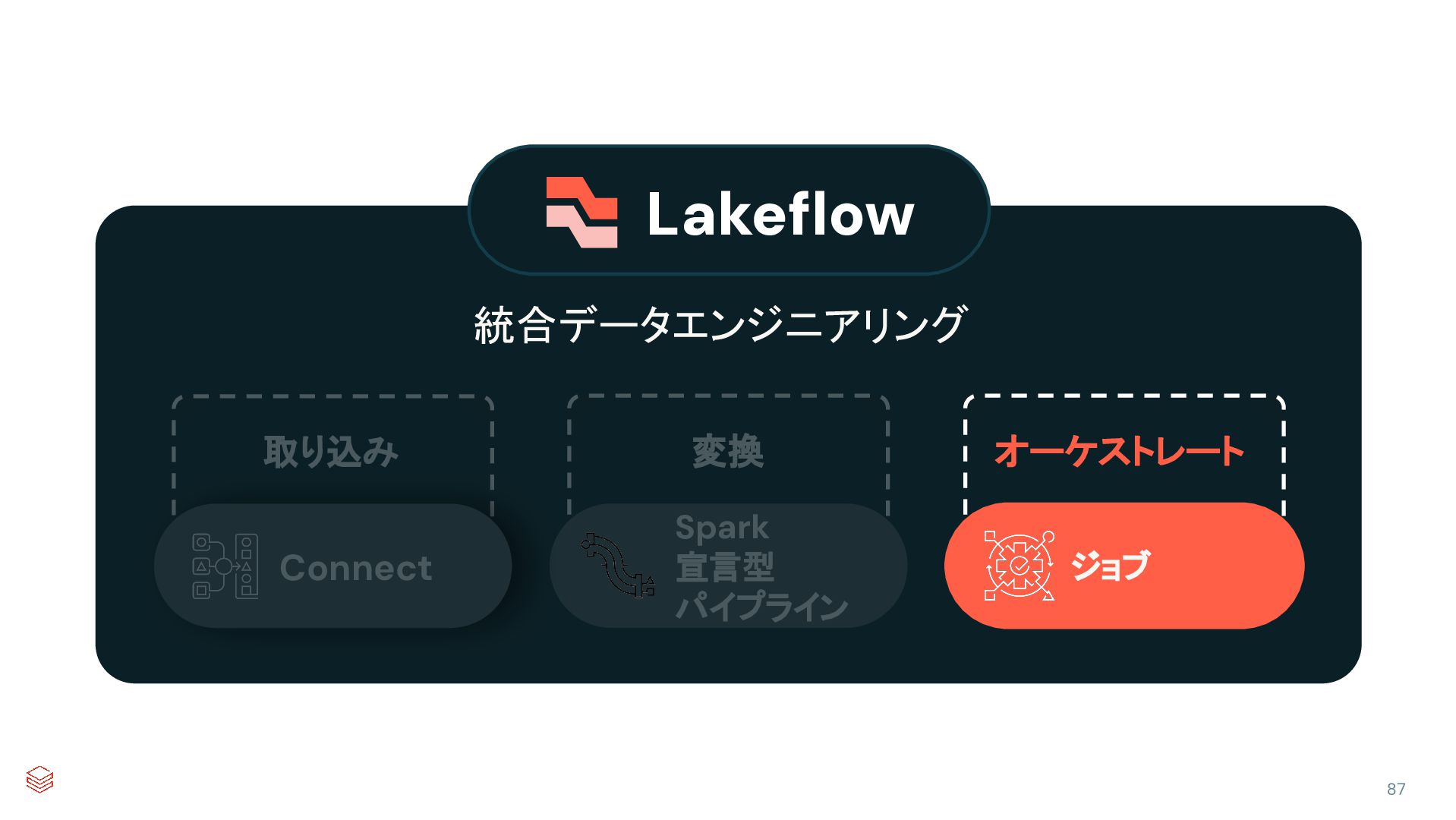 め、データアナリストやエンジニアはツールに費やす時間を削減し、データから価値を引き出すこと に集 中できます。 ETL開発を加速 インフラストラクチャを 自動管理 データへの 信頼を確保 バッチと ストリーミングを 簡素化 https://www.databricks.com/jp/product/data-engineering/spark-declarative-pipelines 59