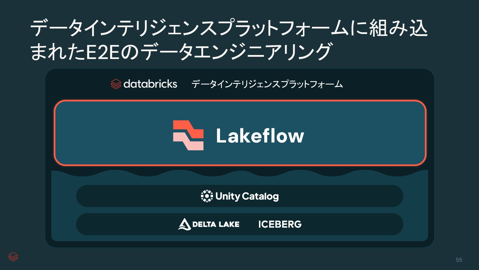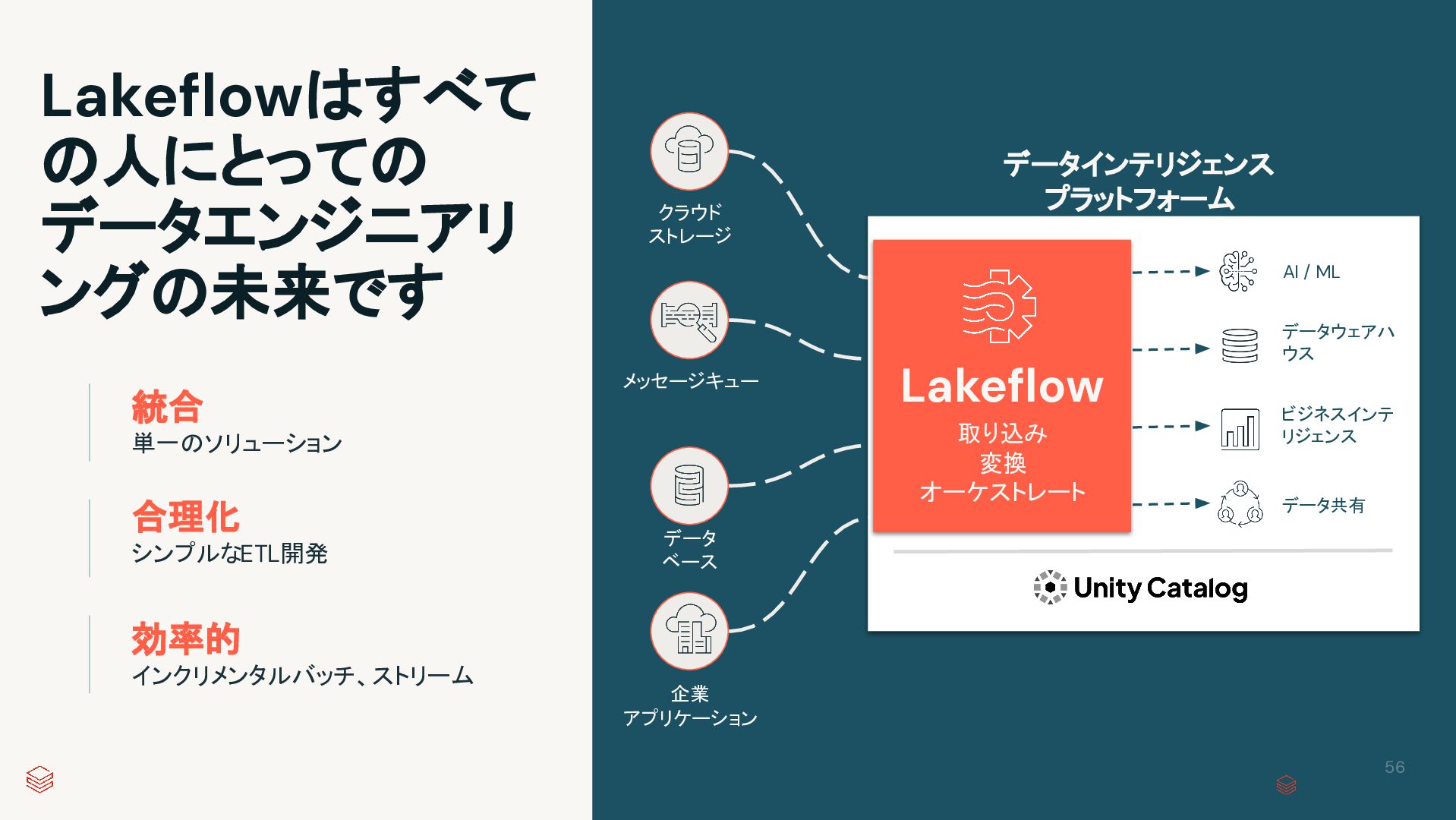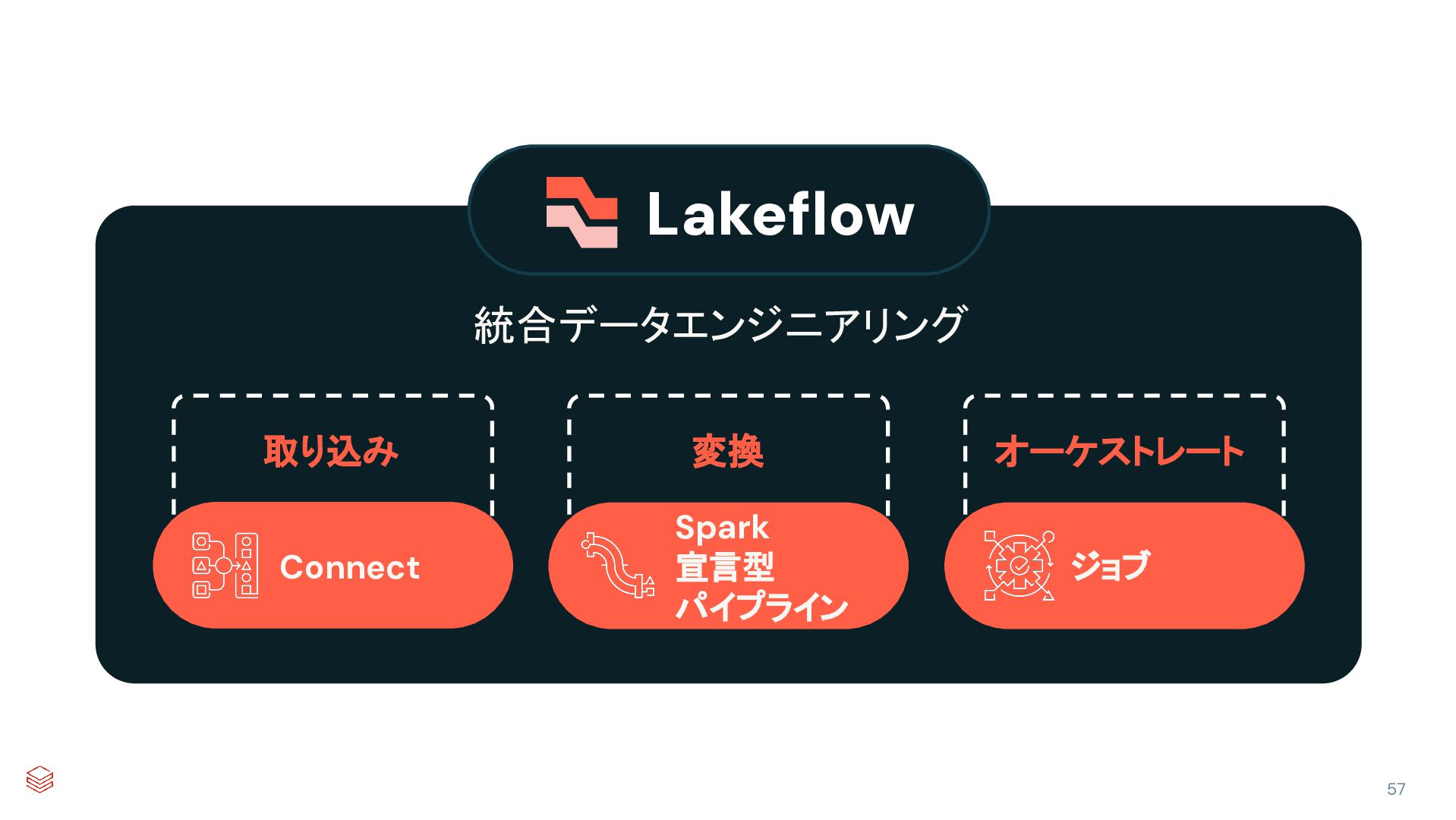 クラウド ストレージ メッセージキュー データ ベース 企業 アプリケーション データインテリジェンス プラットフォーム データウェアハ ウス ビジネスインテ リジェンス AI / ML データ共有 Lakeflowはすべて の人にとっての データエンジニアリ ングの未来です 56
