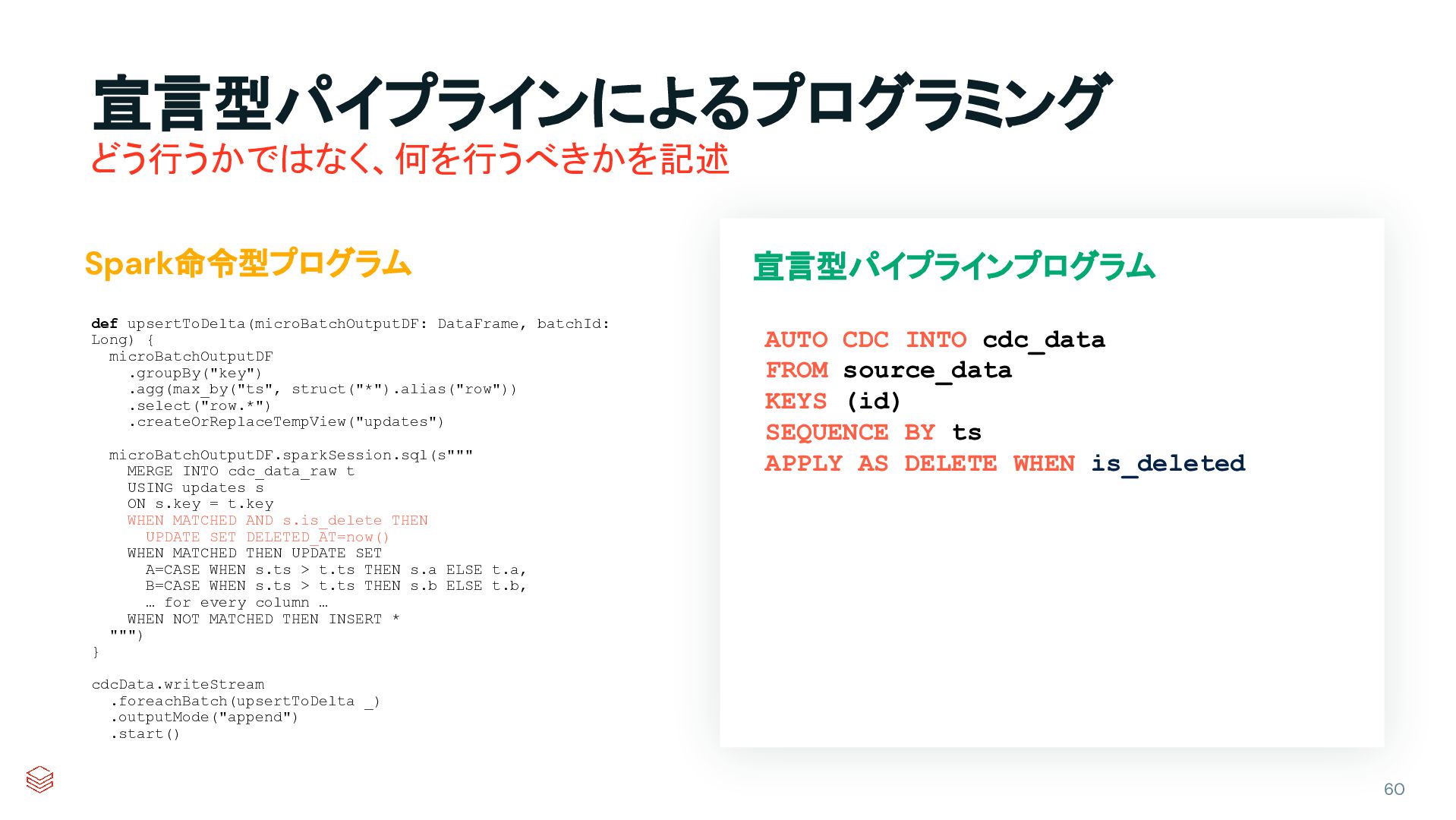 .groupBy("key") .agg(max_by("ts", struct("*").alias("row")) .select("row.*") .createOrReplaceTempView("updates") microBatchOutputDF.sparkSession.sql(s""" MERGE INTO cdc_data_raw t USING updates s ON s.key = t.key WHEN MATCHED AND s.is_delete THEN UPDATE SET DELETED_AT=now() WHEN MATCHED THEN UPDATE SET A=CASE WHEN s.ts > t.ts THEN s.a ELSE t.a, B=CASE WHEN s.ts > t.ts THEN s.b ELSE t.b, … for every column … WHEN NOT MATCHED THEN INSERT * """) } cdcData.writeStream .foreachBatch(upsertToDelta _) .outputMode("append") .start() AUTO CDC INTO cdc_data FROM source_data KEYS (id) SEQUENCE BY ts APPLY AS DELETE WHEN is_deleted Spark命令型プログラム 60