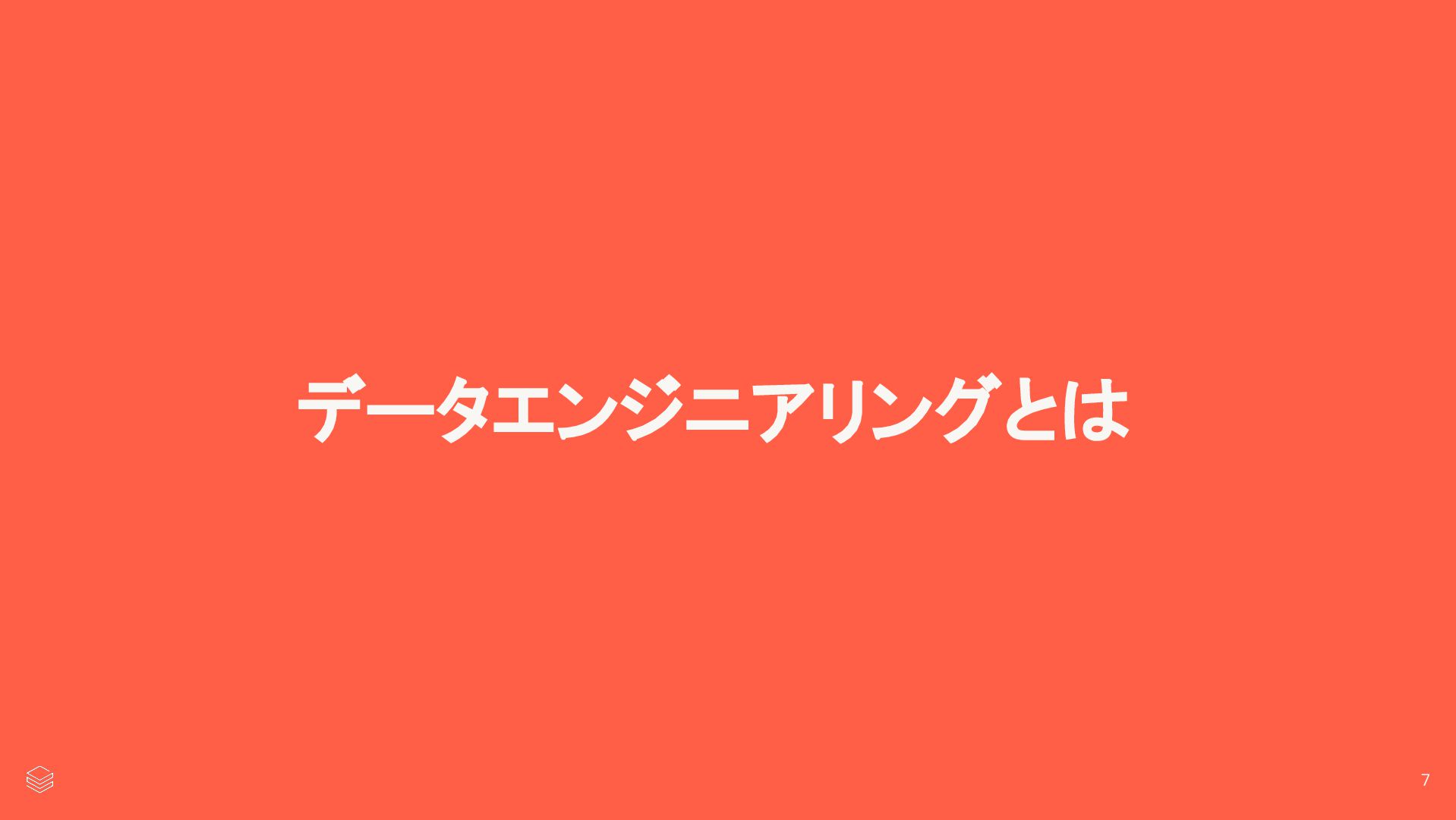 6. データエンジニアリングとは データエンジニアリングは、需要の高まっているスキル です。データエンジニアは、 データを統合し、あなたたちがナビゲートする助けとなるシステムを設計する人たち です。データエンジニアは以下を含む様々なタスクを実行します: • 取得:ビジネスに関連するすべての様々なデータセットを特定します • クレンジング: データにおけるすべてのエラーを特定し、綺麗にします