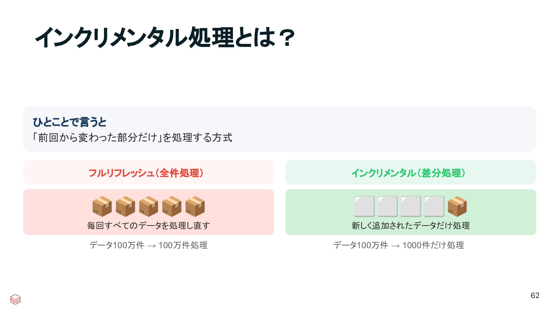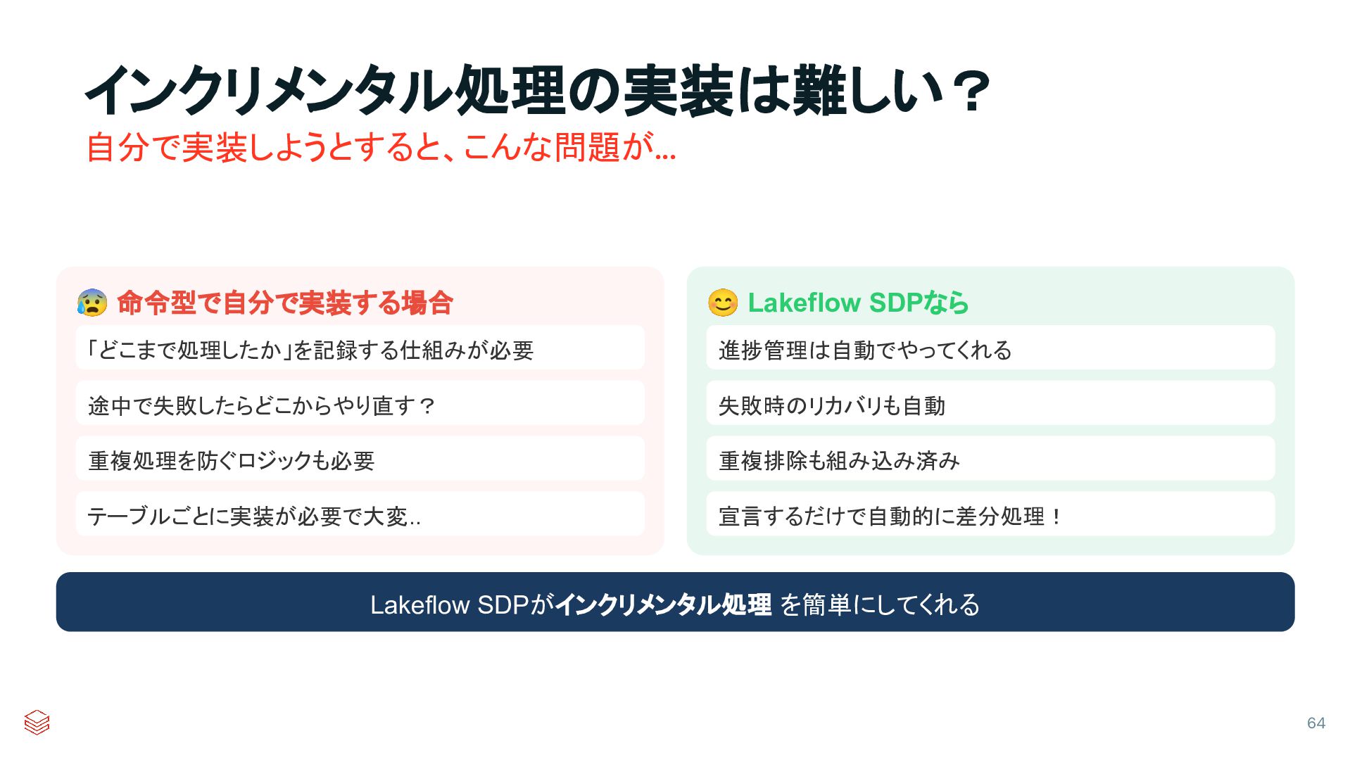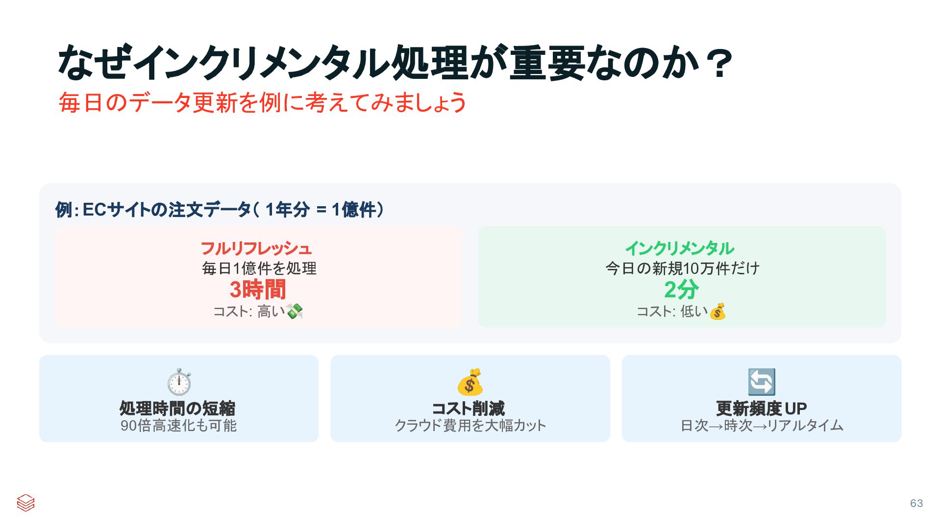 今日の新規10万件だけ 2分 コスト: 低い💰 ⏱ 処理時間の短縮 90倍高速化も可能 💰 コスト削減 クラウド費用を大幅カット 🔄 更新頻度UP 日次→時次→リアルタイム なぜインクリメンタル処理が重要なのか? 63 毎日のデータ更新を例に考えてみましょう