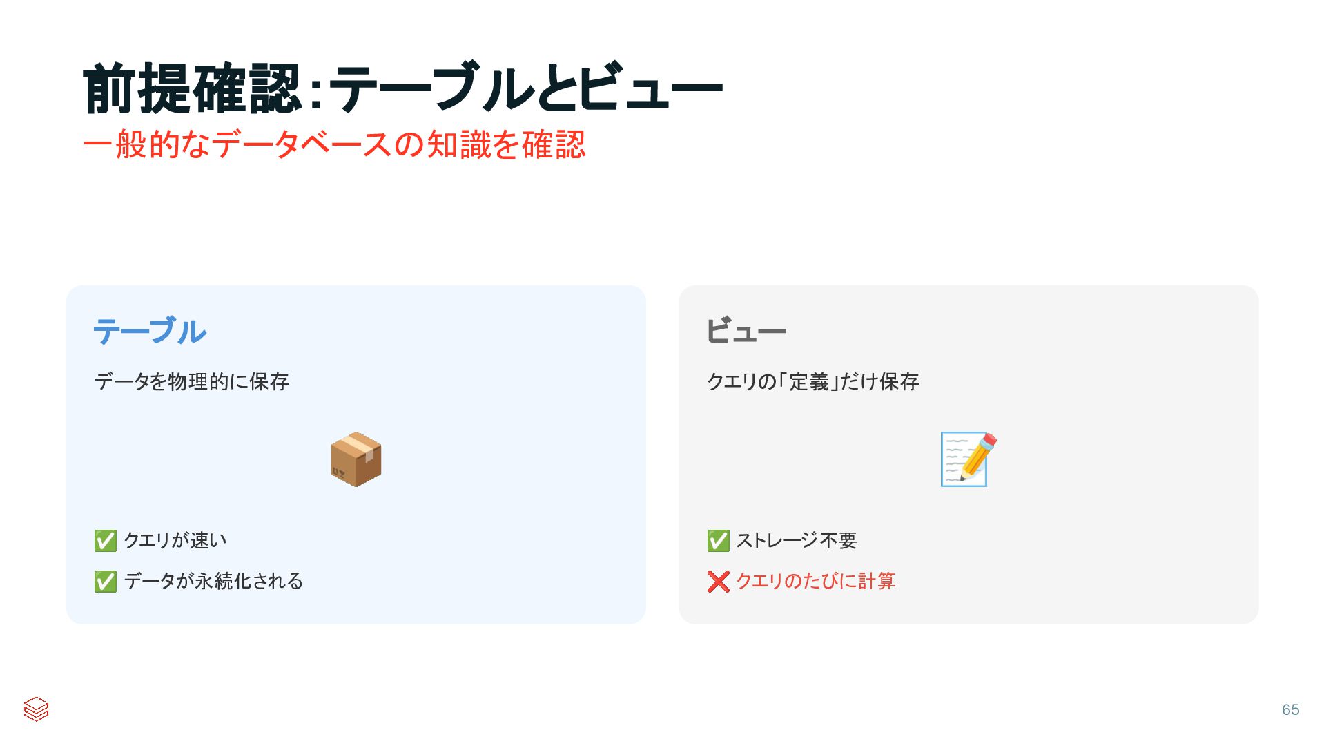 ✅ ストレージ不要 ❌ クエリのたびに計算 前提確認:テーブルとビュー 65 一般的なデータベースの知識を確認