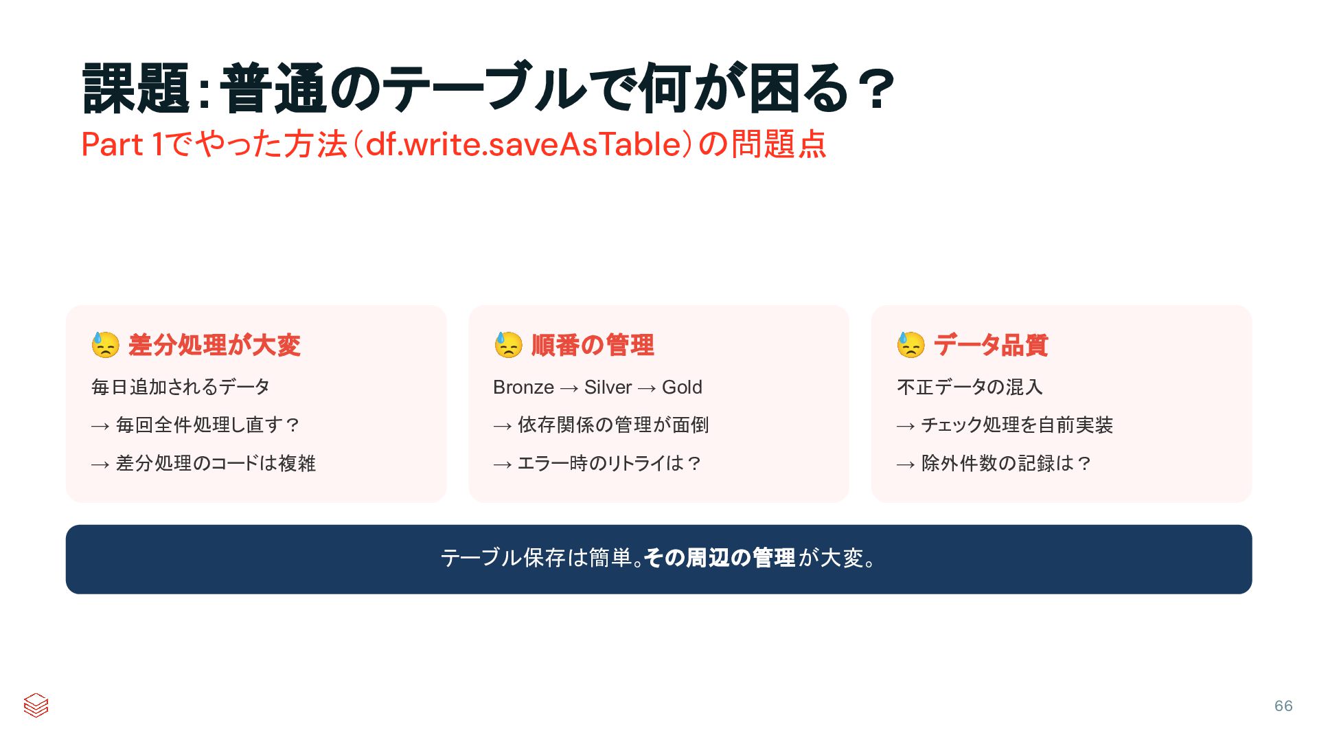 → Silver → Gold → 依存関係の管理が面倒 → エラー時のリトライは? 😓 データ品質 不正データの混入 → チェック処理を自前実装 → 除外件数の記録は? テーブル保存は簡単。その周辺の管理が大変。 課題:普通のテーブルで何が困る? 66 Part 1でやった方法(df.write.saveAsTable)の問題点