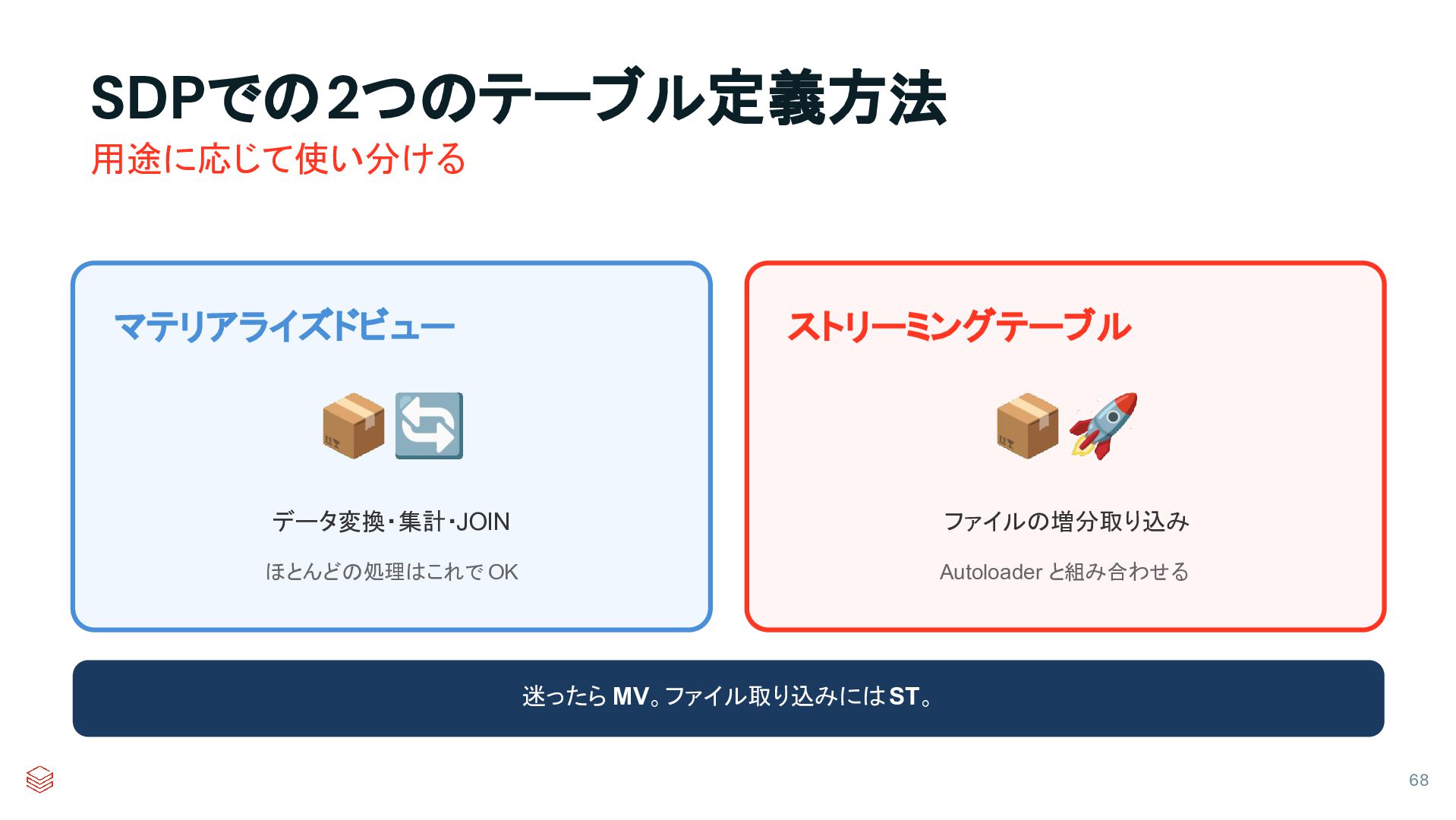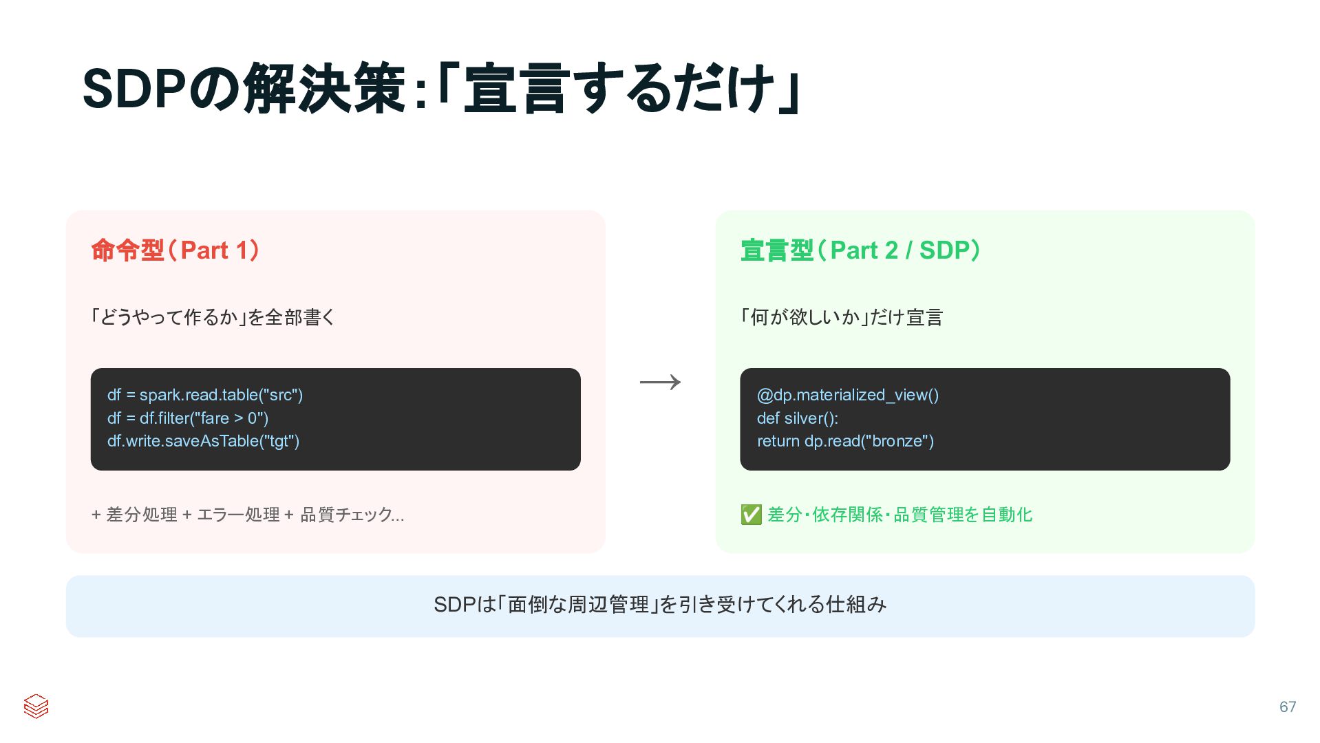 0") df.write.saveAsTable("tgt") + 差分処理 + エラー処理 + 品質チェック... → 宣言型(Part 2 / SDP) 「何が欲しいか」だけ宣言 @dp.materialized_view() def silver(): return dp.read("bronze") ✅ 差分・依存関係・品質管理を自動化 SDPは「面倒な周辺管理」を引き受けてくれる仕組み SDPの解決策:「宣言するだけ」 67