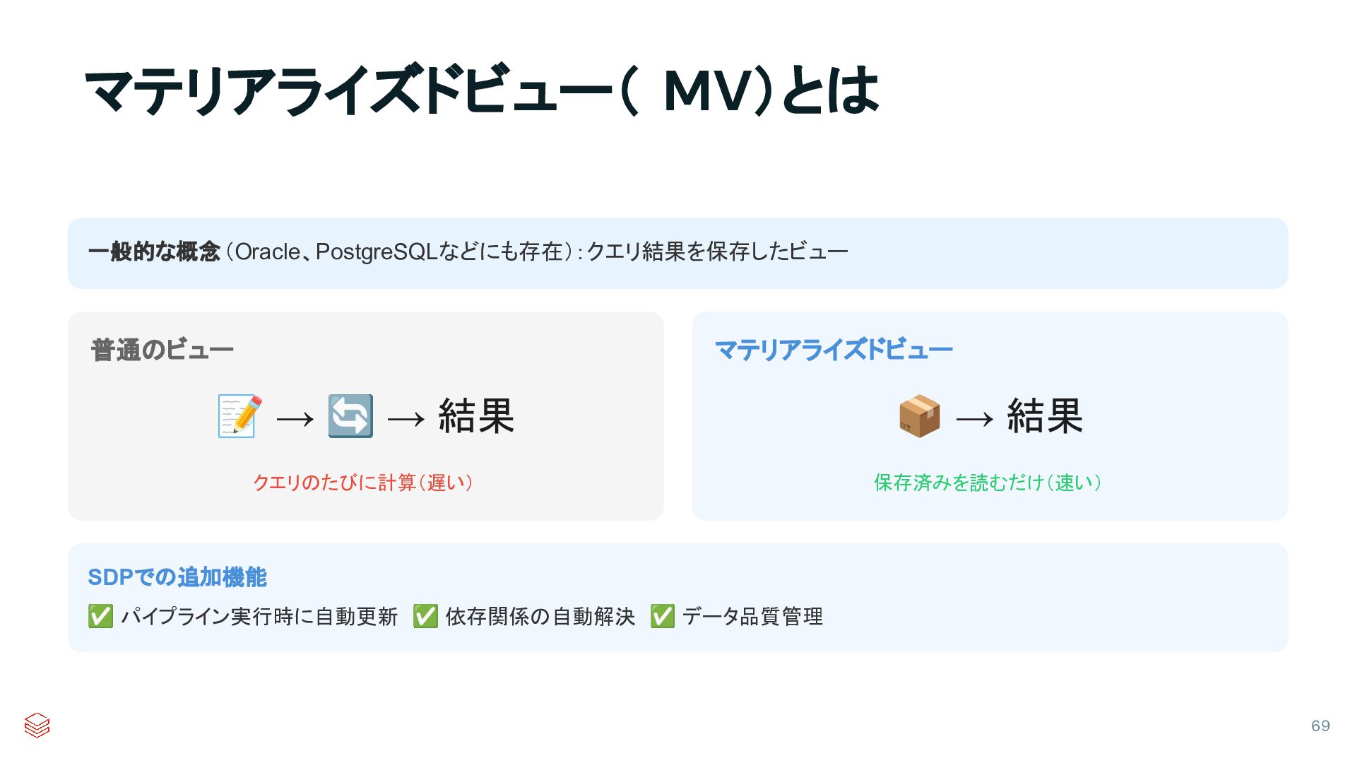 → 結果 保存済みを読むだけ(速い) SDPでの追加機能 ✅ パイプライン実行時に自動更新 ✅ 依存関係の自動解決 ✅ データ品質管理 マテリアライズドビュー( MV)とは 69