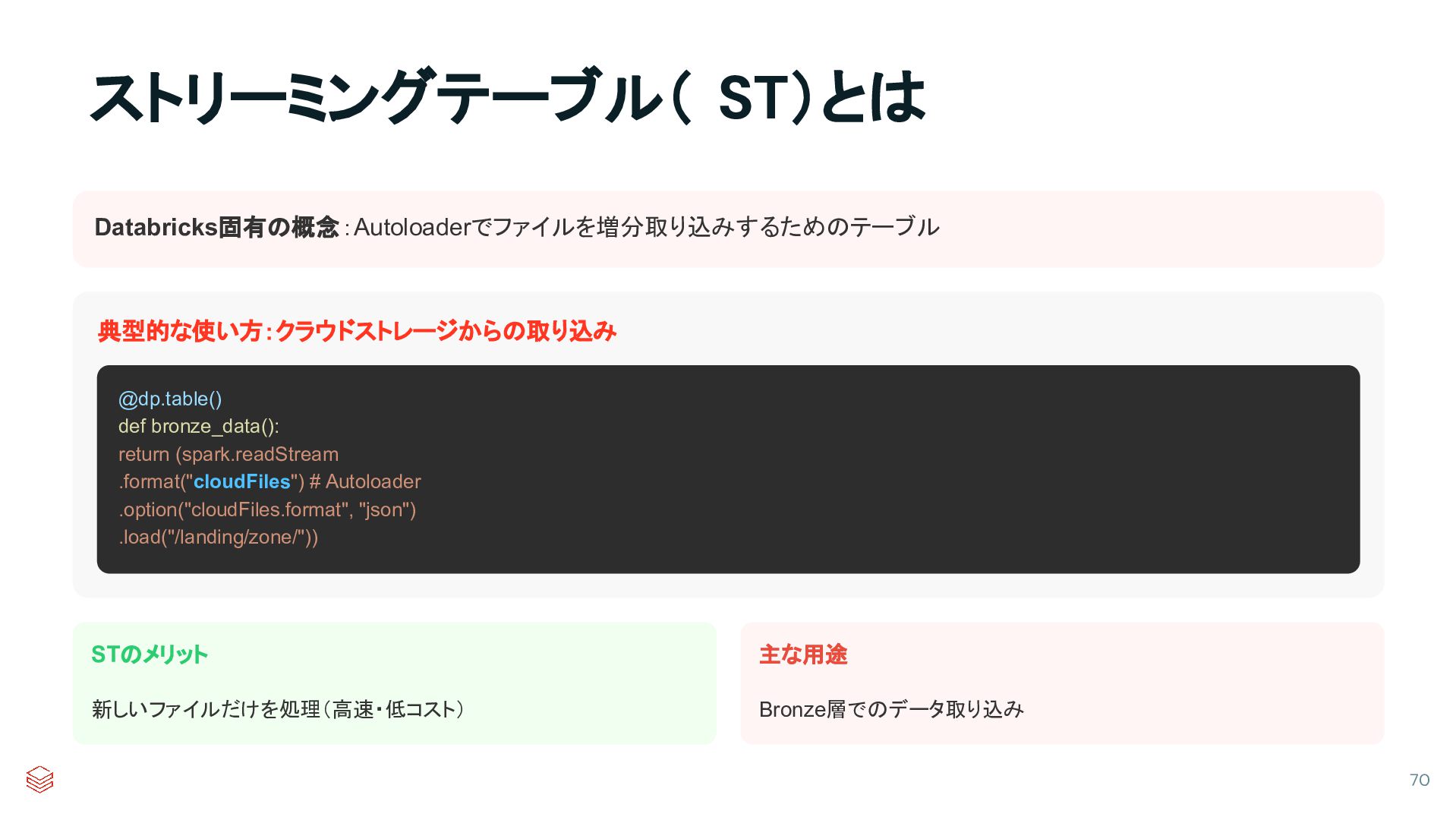 .option("cloudFiles.format", "json") .load("/landing/zone/")) STのメリット 新しいファイルだけを処理(高速・低コスト) 主な用途 Bronze層でのデータ取り込み ストリーミングテーブル( ST)とは 70