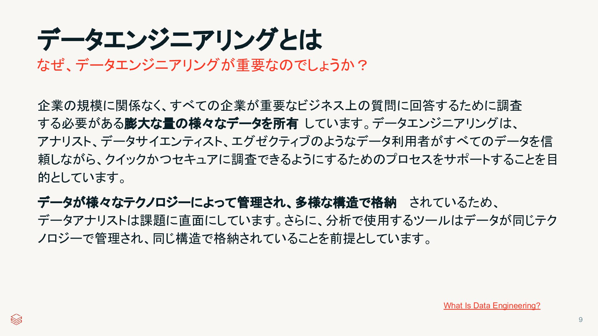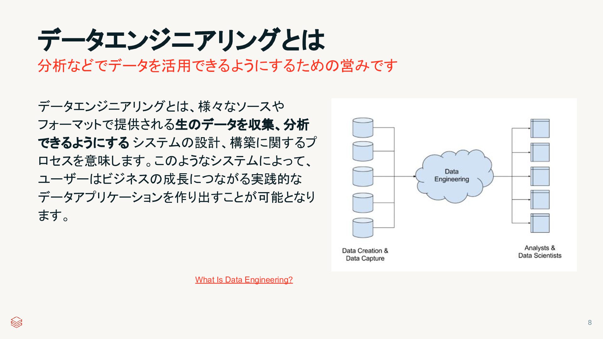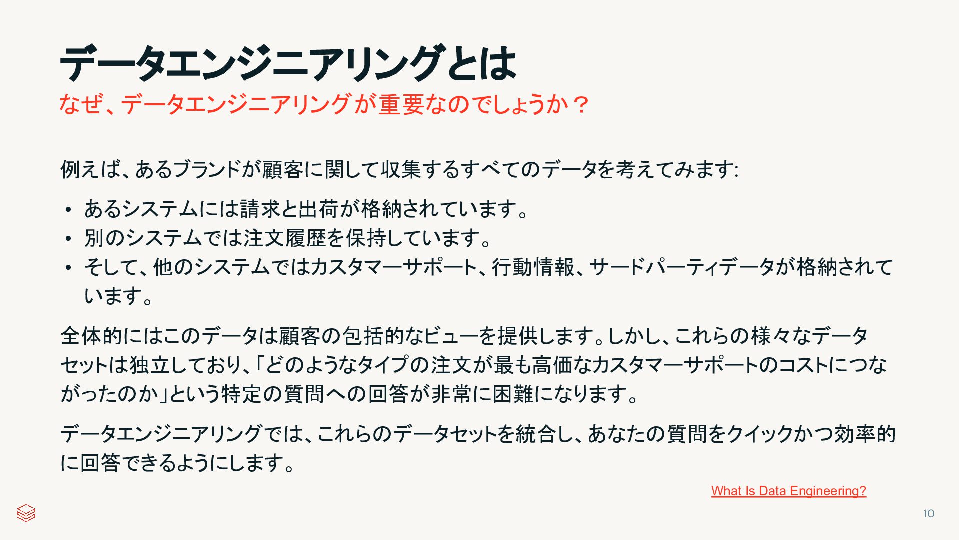 セットは独立しており、「どのようなタイプの注文が最も高価なカスタマーサポートのコストにつな がったのか」という特定の質問への回答が非常に困難になります。 データエンジニアリングでは、これらのデータセットを統合し、あなたの質問をクイックかつ効率的 に回答できるようにします。 What Is Data Engineering? 10 なぜ、データエンジニアリングが重要なのでしょうか?