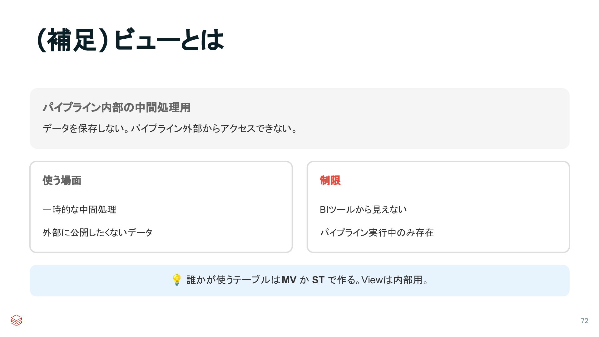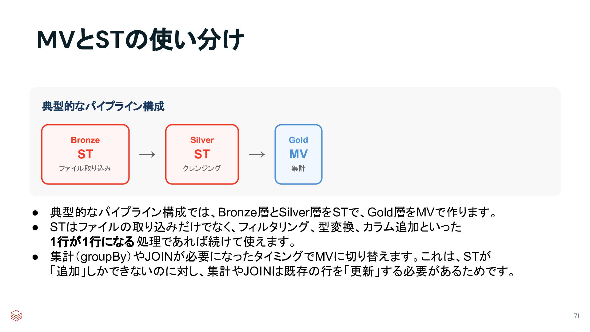 MV 集計 MVとSTの使い分け 71 • 典型的なパイプライン構成では、Bronze層とSilver層をSTで、Gold層をMVで作ります。 • STはファイルの取り込みだけでなく、フィルタリング、型変換、カラム追加といった 1行が1行になる処理であれば続けて使えます。 • 集計(groupBy)やJOINが必要になったタイミングでMVに切り替えます。これは、STが 「追加」しかできないのに対し、集計やJOINは既存の行を「更新」する必要があるためです。