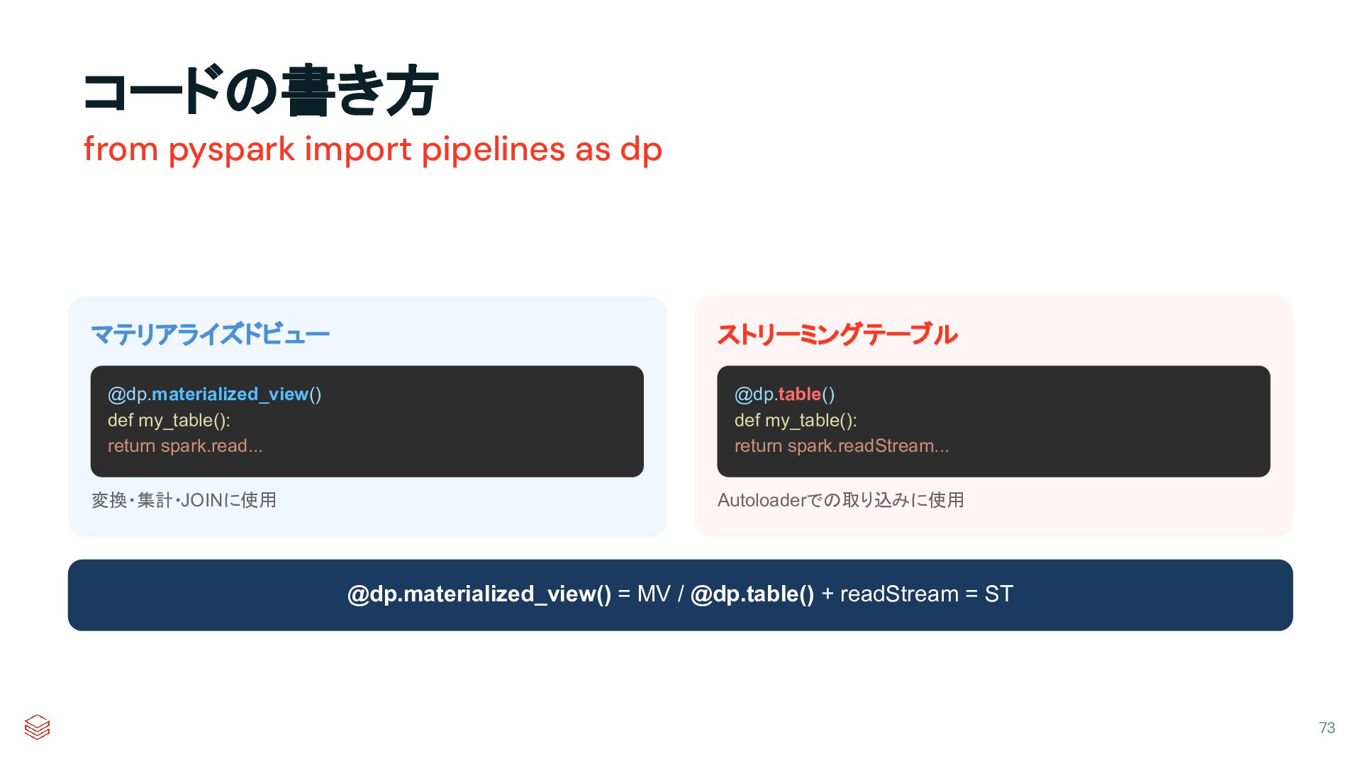 my_table(): return spark.readStream... Autoloaderでの取り込みに使用 @dp.materialized_view() = MV / @dp.table() + readStream = ST コードの書き方 73 from pyspark import pipelines as dp