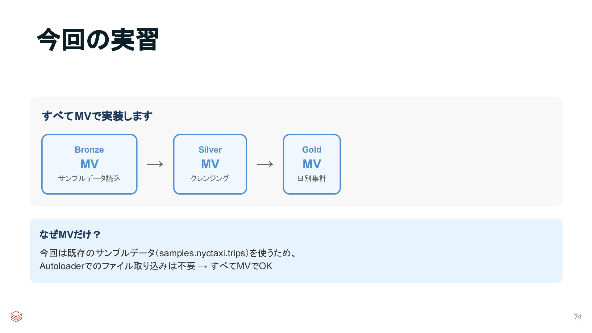 MV 日別集計 なぜMVだけ? 今回は既存のサンプルデータ(samples.nyctaxi.trips)を使うため、 Autoloaderでのファイル取り込みは不要 → すべてMVでOK 今回の実習 74