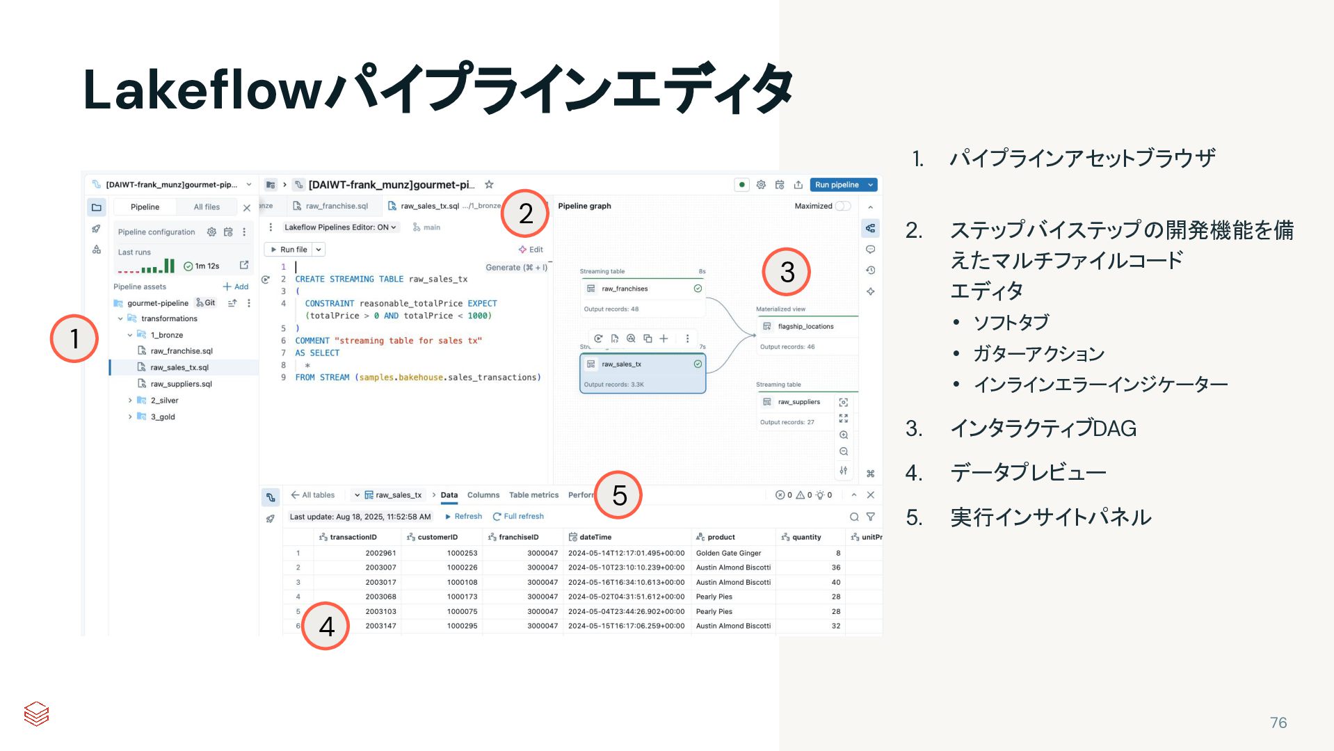 ガターアクション • インラインエラーインジケーター 3. インタラクティブDAG 4. データプレビュー 5. 実行インサイトパネル 1 2 3 4 5 76