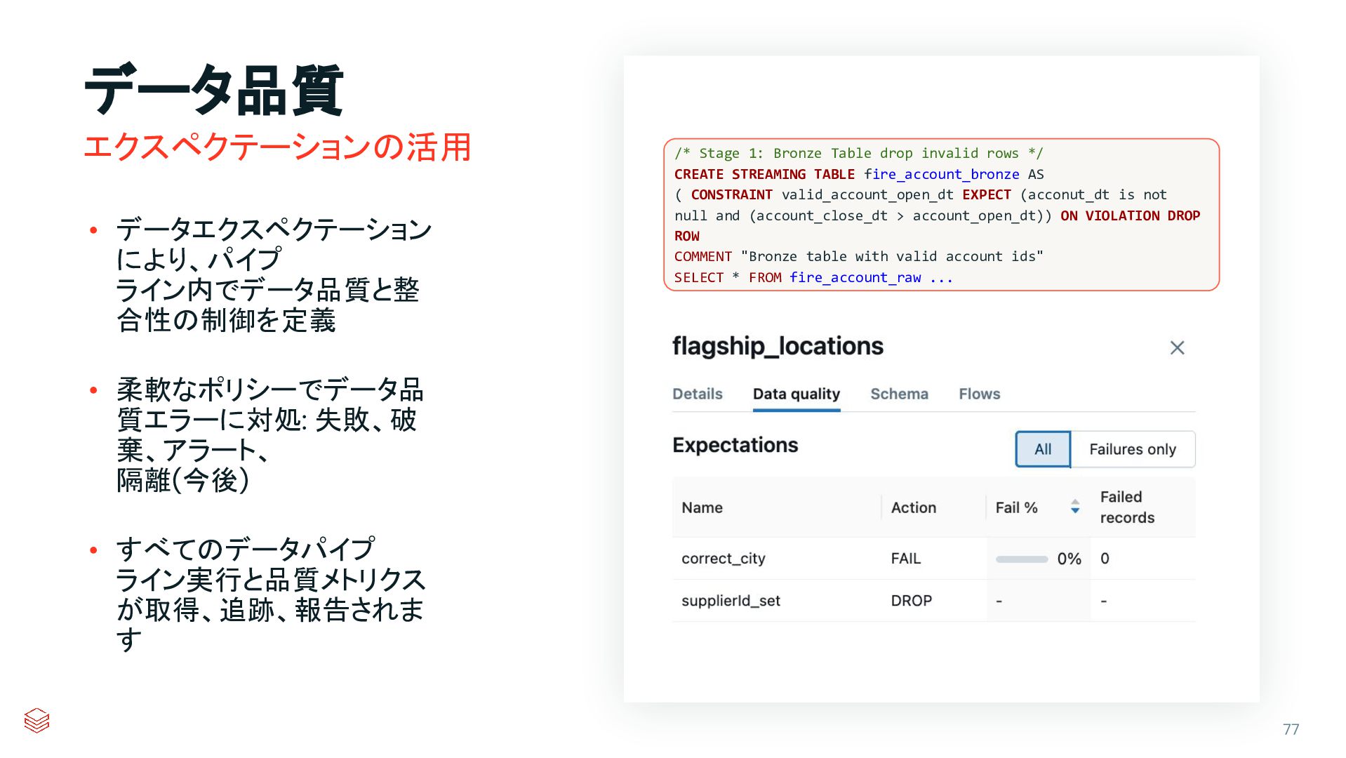 失敗、破 棄、アラート、 隔離(今後) • すべてのデータパイプ ライン実行と品質メトリクス が取得、追跡、報告されま す /* Stage 1: Bronze Table drop invalid rows */ CREATE STREAMING TABLE fire_account_bronze AS ( CONSTRAINT valid_account_open_dt EXPECT (acconut_dt is not null and (account_close_dt > account_open_dt)) ON VIOLATION DROP ROW COMMENT "Bronze table with valid account ids" SELECT * FROM fire_account_raw ... 77