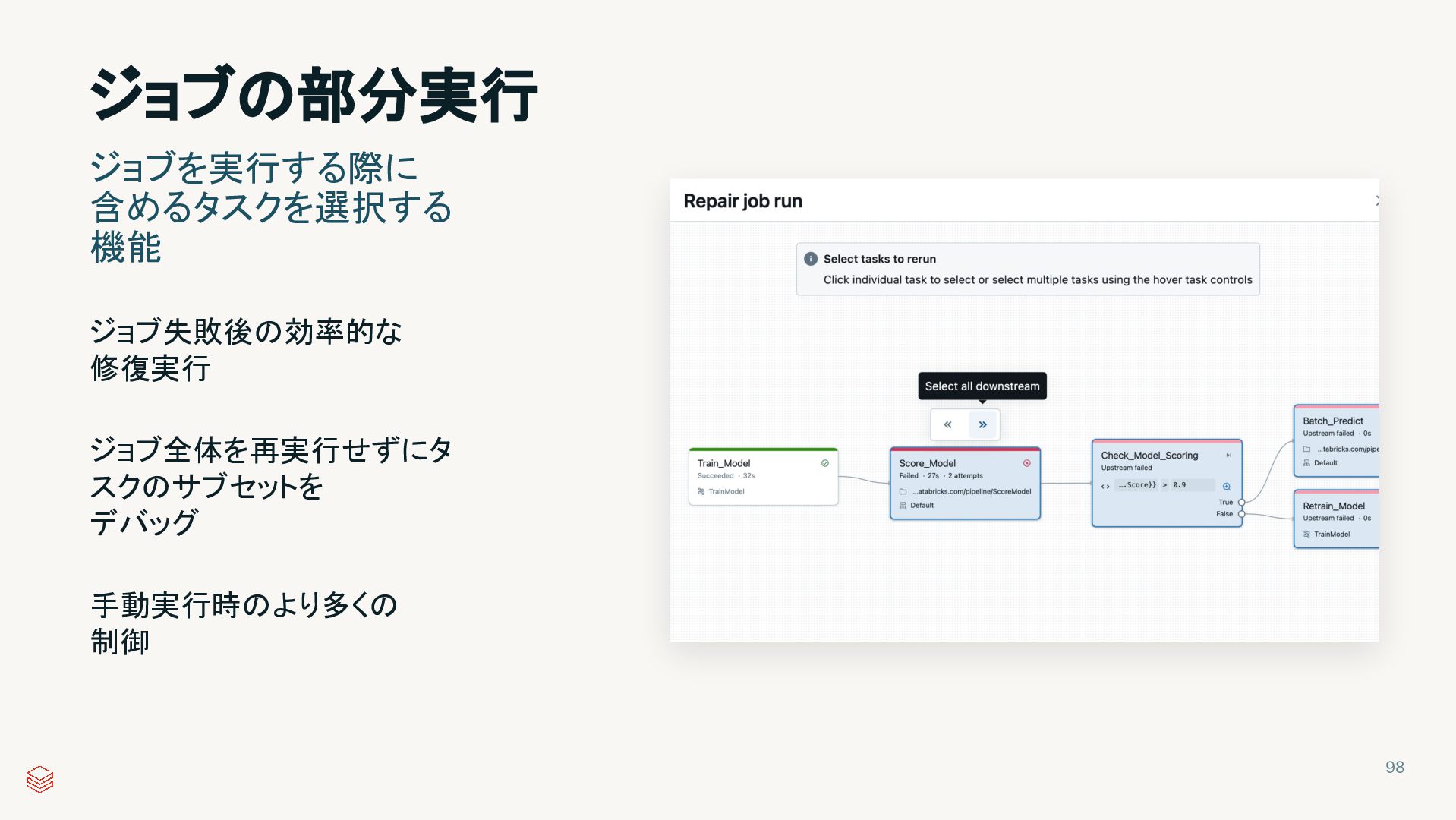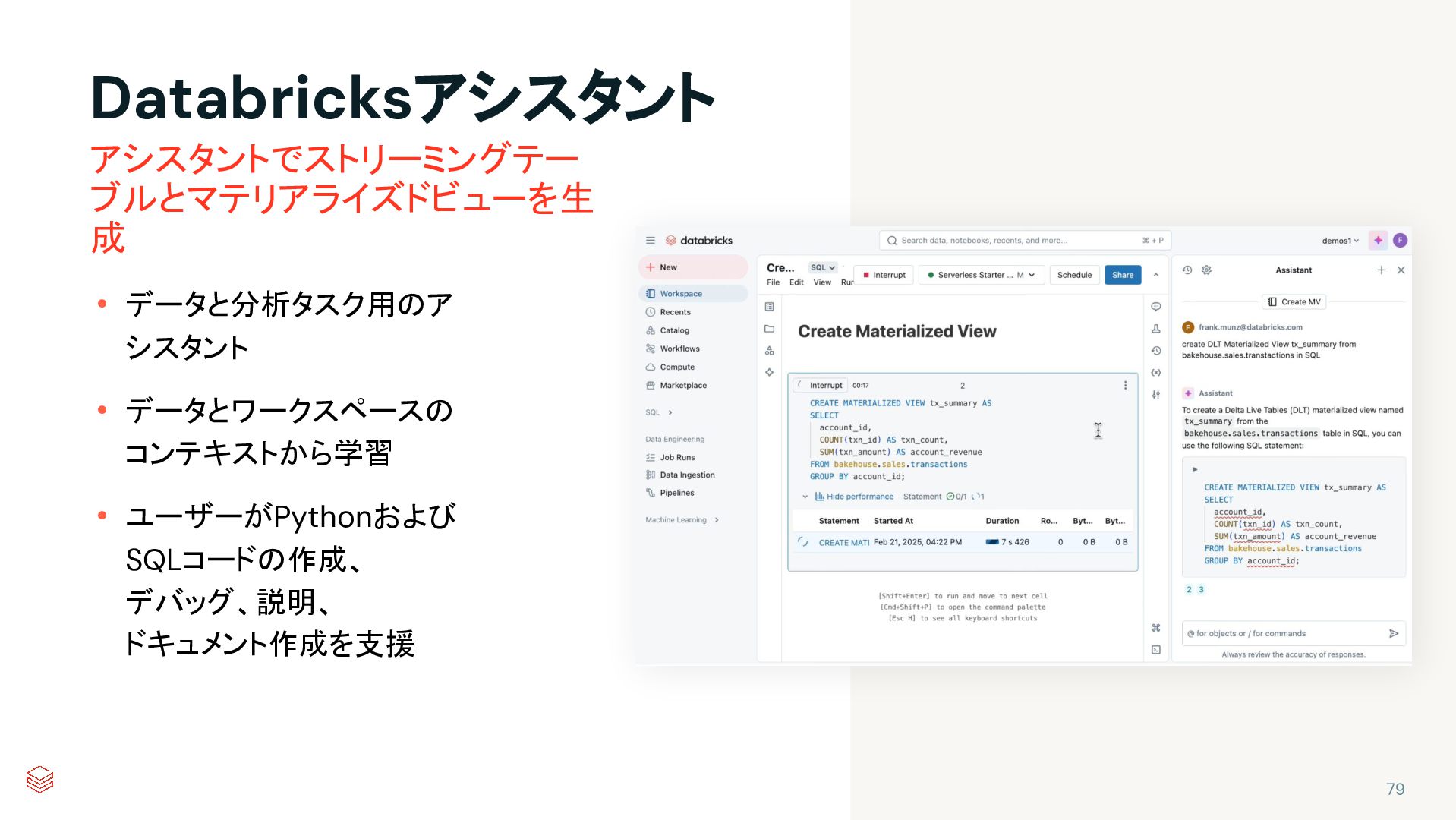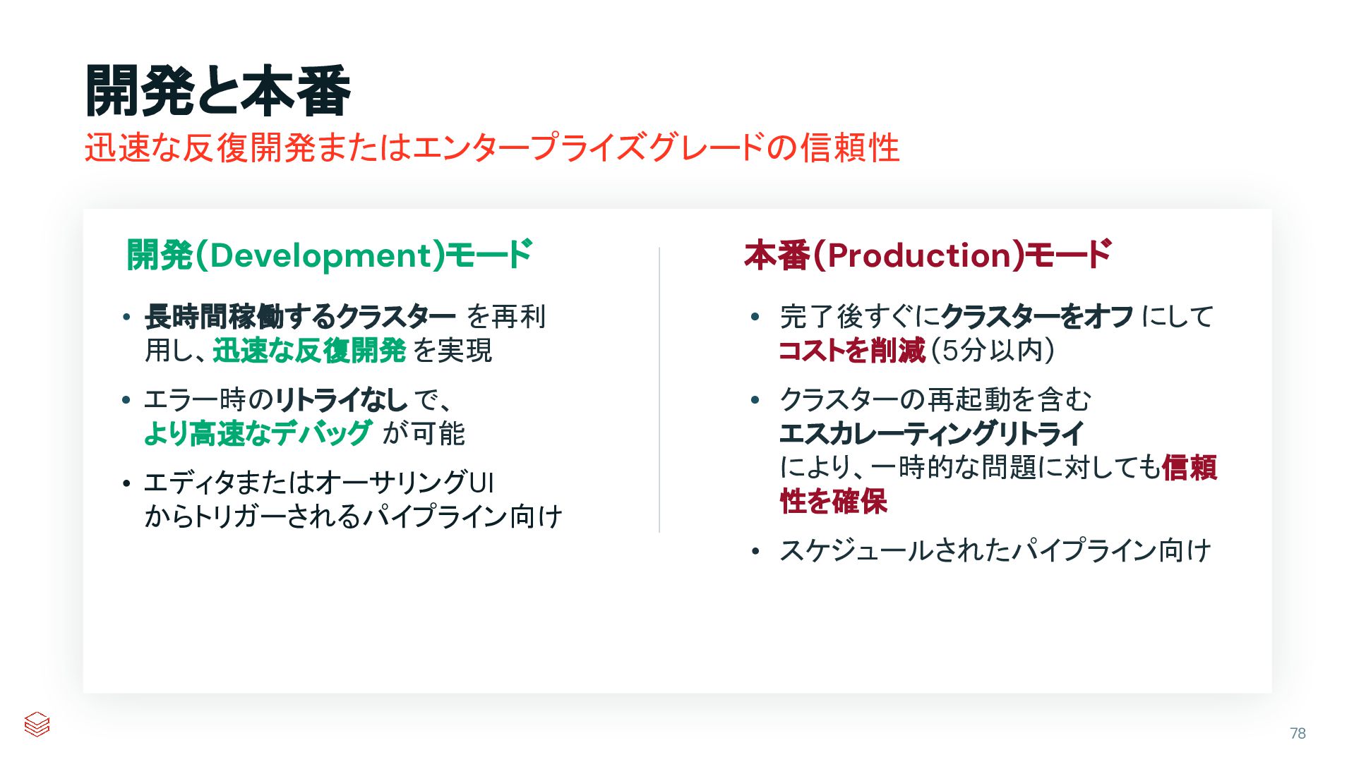 で、 より高速なデバッグ が可能 • エディタまたはオーサリングUI からトリガーされるパイプライン向け • 完了後すぐにクラスターをオフ にして コストを削減 (5分以内) • クラスターの再起動を含む エスカレーティングリトライ により、一時的な問題に対しても信頼 性を確保 • スケジュールされたパイプライン向け 本番(Production)モード 78