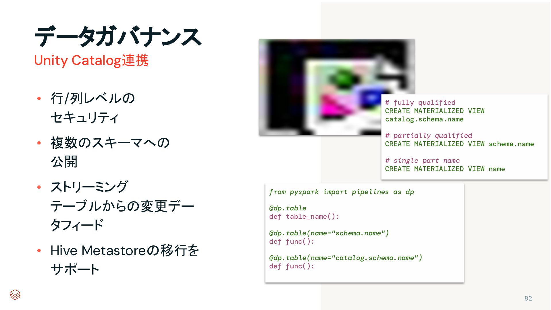タフィード • Hive Metastoreの移行を サポート Unity Catalog連携 # fully qualified CREATE MATERIALIZED VIEW catalog.schema.name # partially qualified CREATE MATERIALIZED VIEW schema.name # single part name CREATE MATERIALIZED VIEW name from pyspark import pipelines as dp @dp.table def table_name(): @dp.table(name="schema.name") def func(): @dp.table(name="catalog.schema.name") def func(): 82