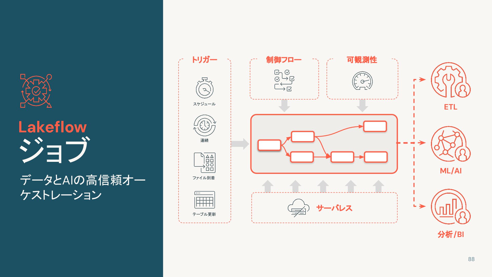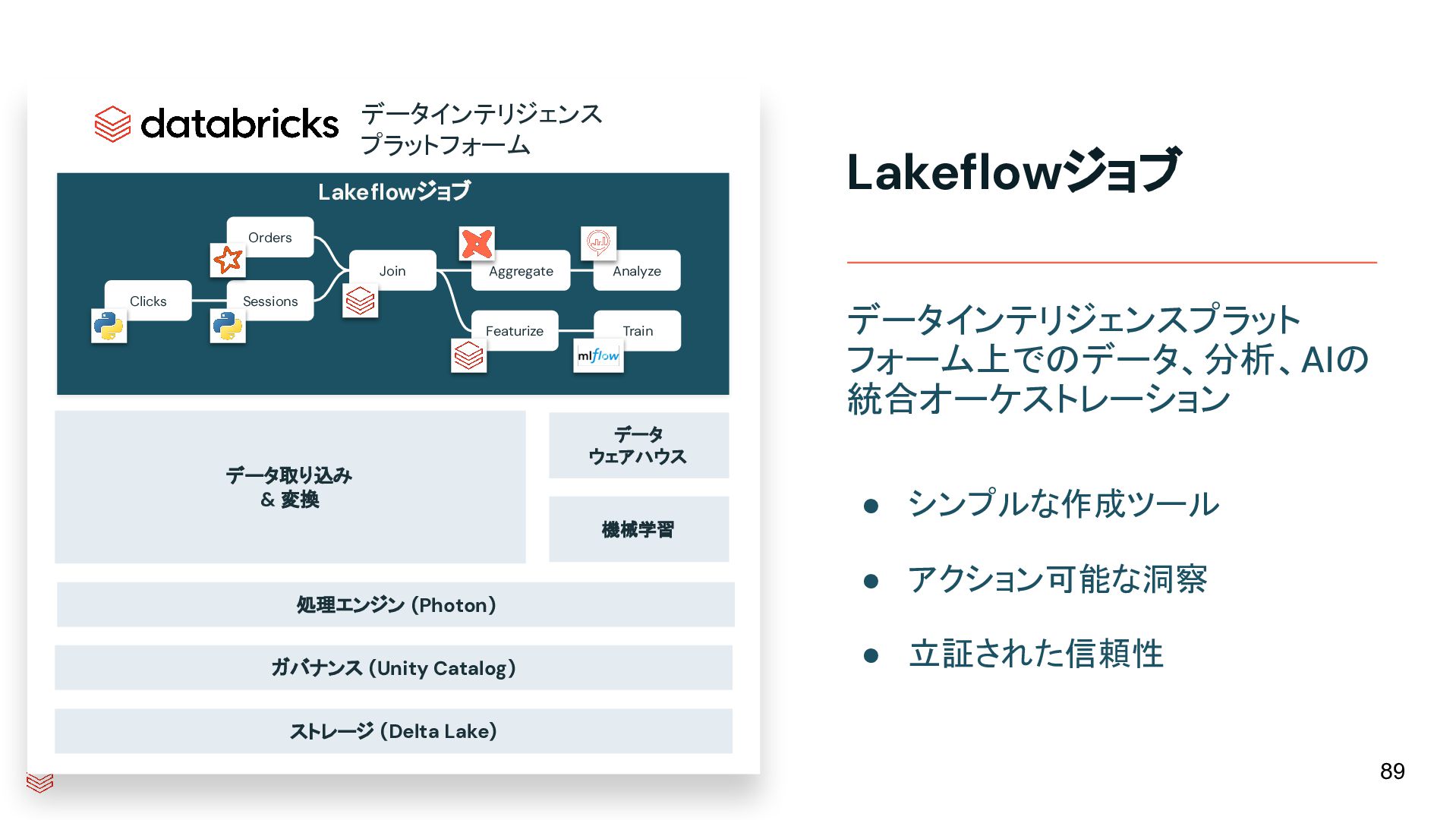 データインテリジェンス プラットフォーム データ取り込み & 変換 処理エンジン (Photon) ガバナンス (Unity Catalog) ストレージ (Delta Lake) データ ウェアハウス 機械学習 Lakeflowジョブ Sessions Clicks Join Featurize Aggregate Analyze Train Orders 89