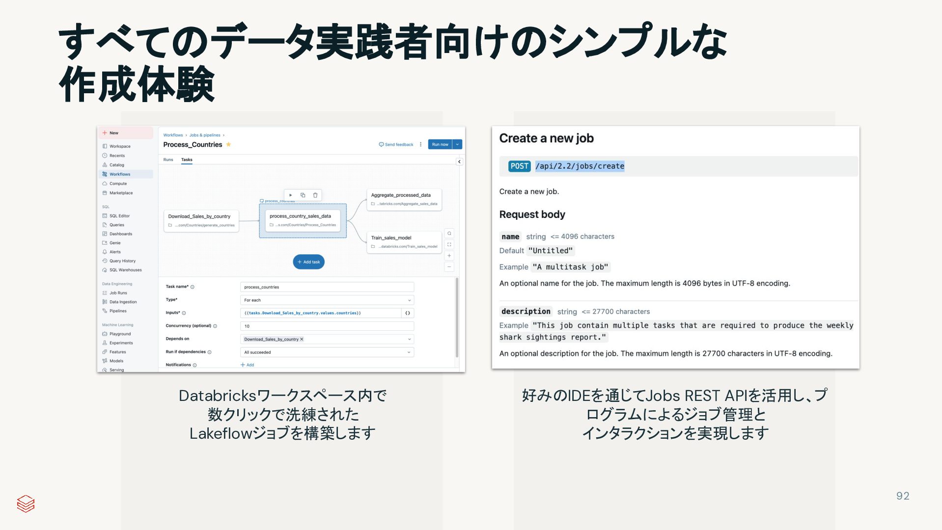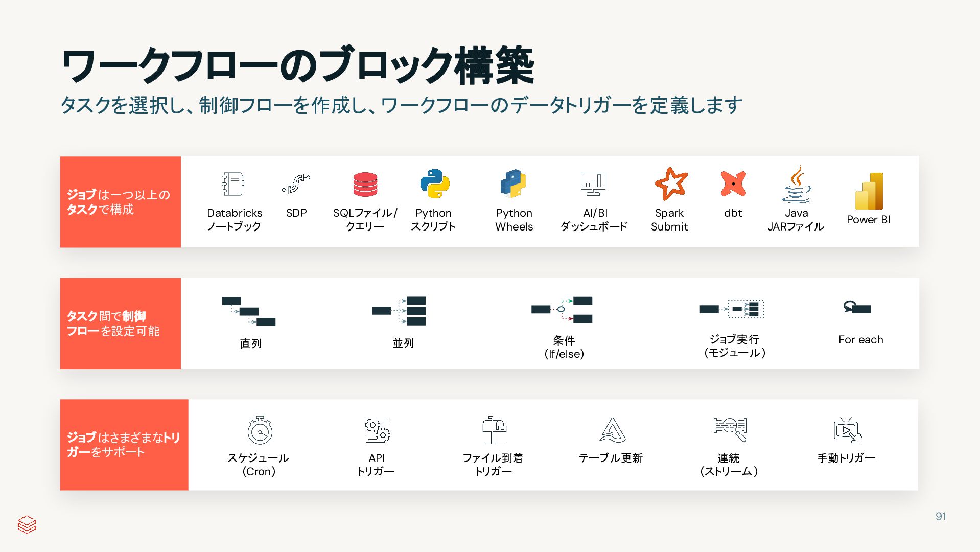 SDP dbt Java JARファイル Spark Submit ジョブは一つ以上の タスクで構成 タスク間で制御 フローを設定可能 ジョブはさまざまなトリ ガーをサポート AI/BI ダッシュボード 手動トリガー スケジュール (Cron) API トリガー ファイル到着 トリガー テーブル更新 連続 (ストリーム) Power BI 直列 並列 条件 (If/else) ジョブ実行 (モジュール) For each 91