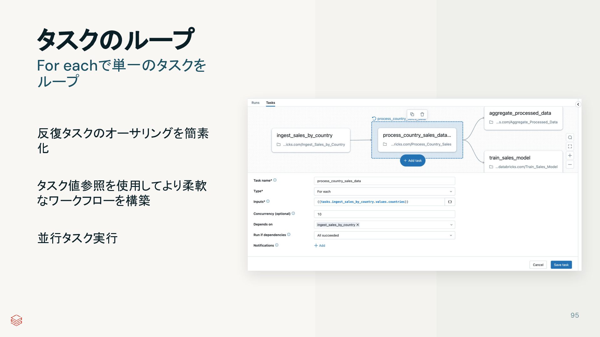 45. ワークフローのブロック構築 タスクを選択し、制御フローを作成し、ワークフローのデータトリガーを定義します Databricks ノートブック Python スクリプト Python Wheels SQLファイル/ クエリー