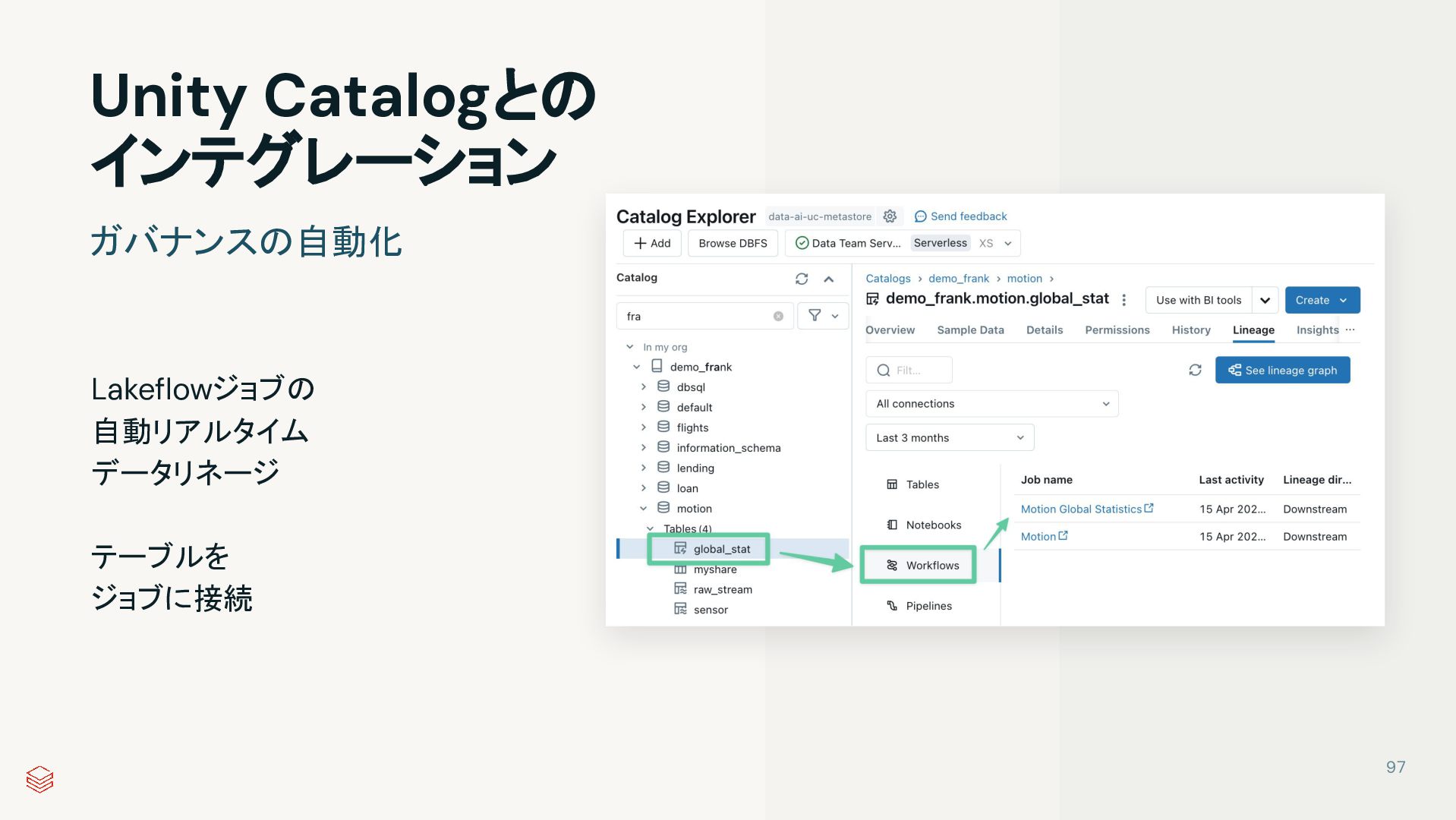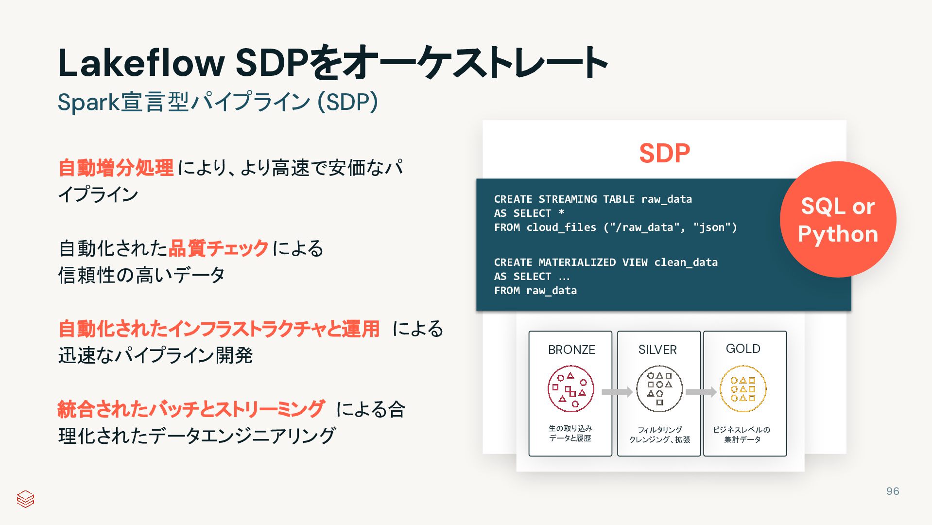 信頼性の高いデータ 統合されたバッチとストリーミング による合 理化されたデータエンジニアリング 自動化されたインフラストラクチャと運用 による 迅速なパイプライン開発 生の取り込み データと履歴 BRONZE フィルタリング クレンジング、拡張 SILVER ビジネスレベルの 集計データ GOLD CREATE STREAMING TABLE raw_data AS SELECT * FROM cloud_files ("/raw_data", "json") CREATE MATERIALIZED VIEW clean_data AS SELECT … FROM raw_data SQL or Python 96