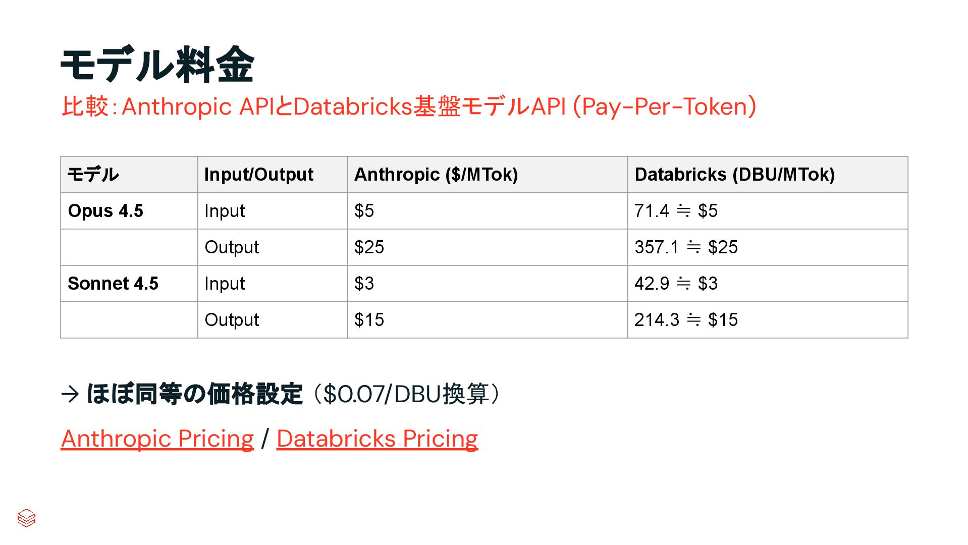モデル料金 → ほぼ同等の価格設定 ($0.07/DBU換算) Anthropic Pricing / Databricks Pricing 比較:Anthropic