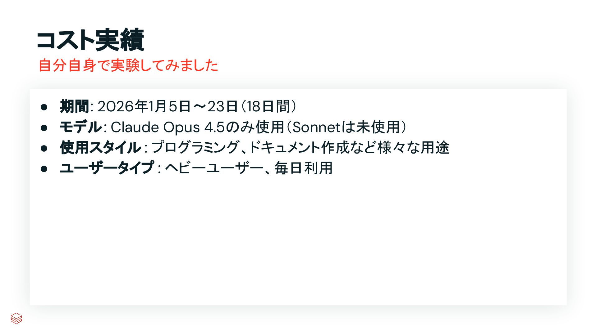 コスト実績 • 期間: 2026年1月5日〜23日(18日間) • モデル: Claude Opus 4.5のみ使用(Sonnetは未使用) •