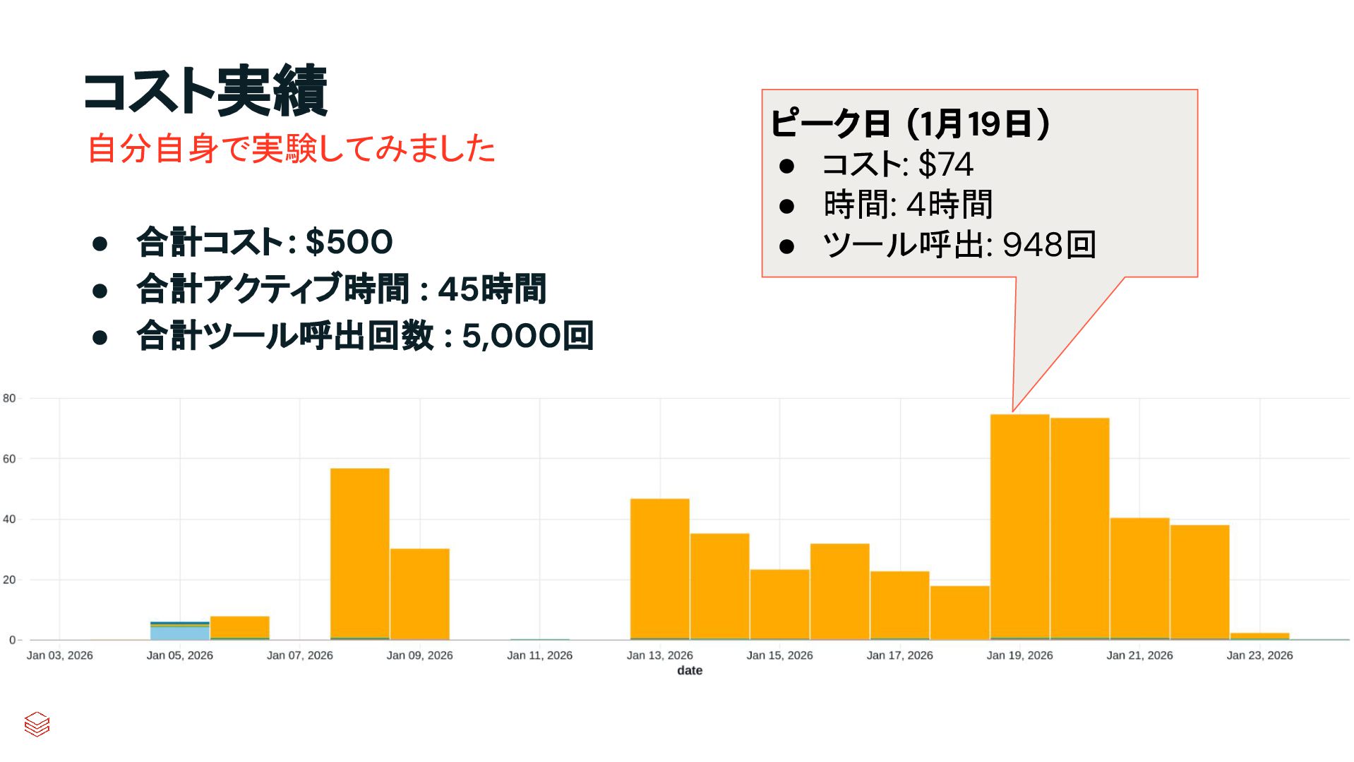 合計ツール呼出回数 : 5,000回 自分自身で実験してみました ピーク日 (1月19日) • コスト: $74 • 時間: 4時間 • ツール呼出: 948回