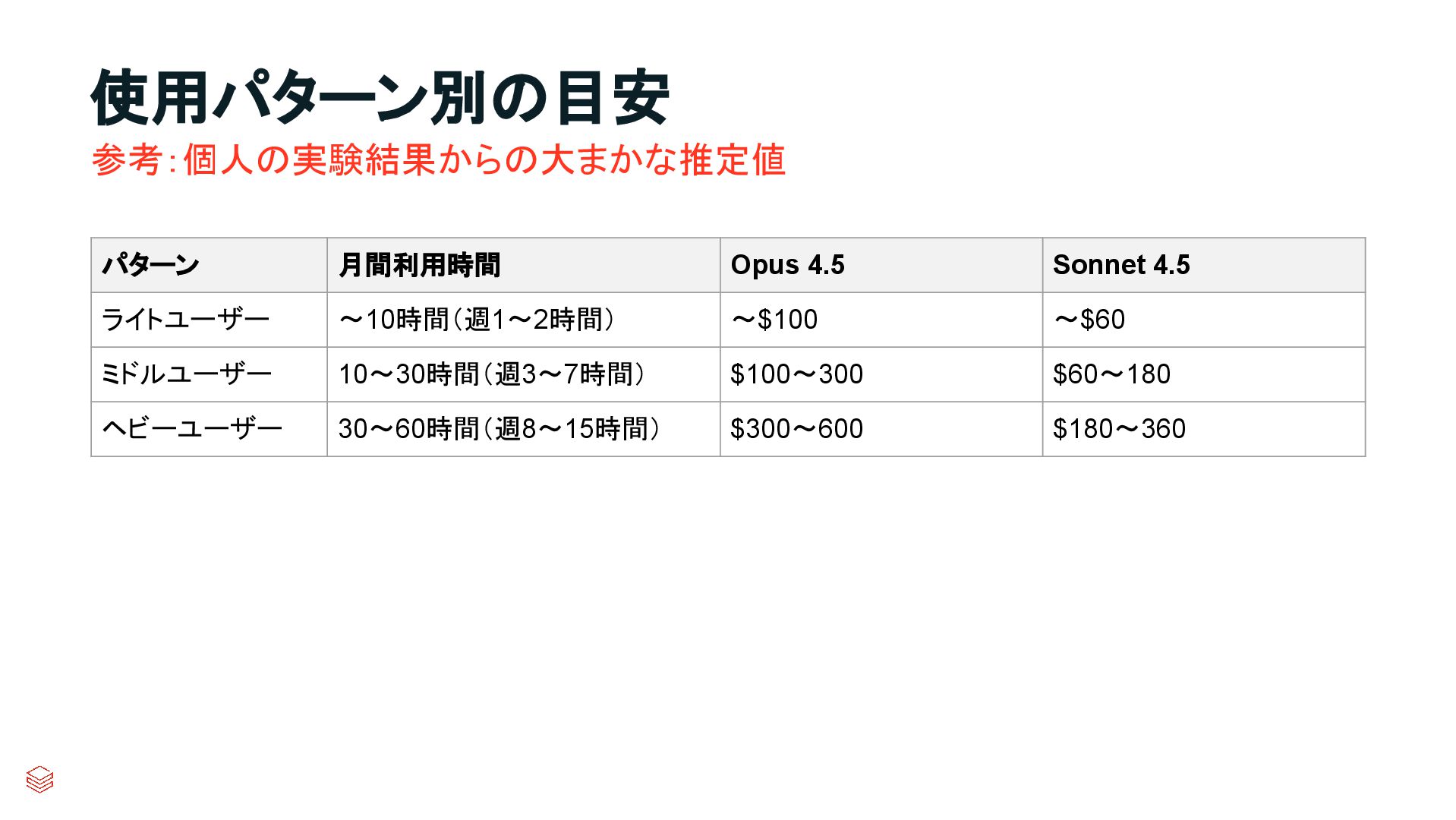 参考:個人の実験結果からの大まかな推定値 使用パターン別の目安 パターン 月間利用時間 Opus 4.5 Sonnet 4.5 ライトユーザー 〜10時間(週1〜2時間)