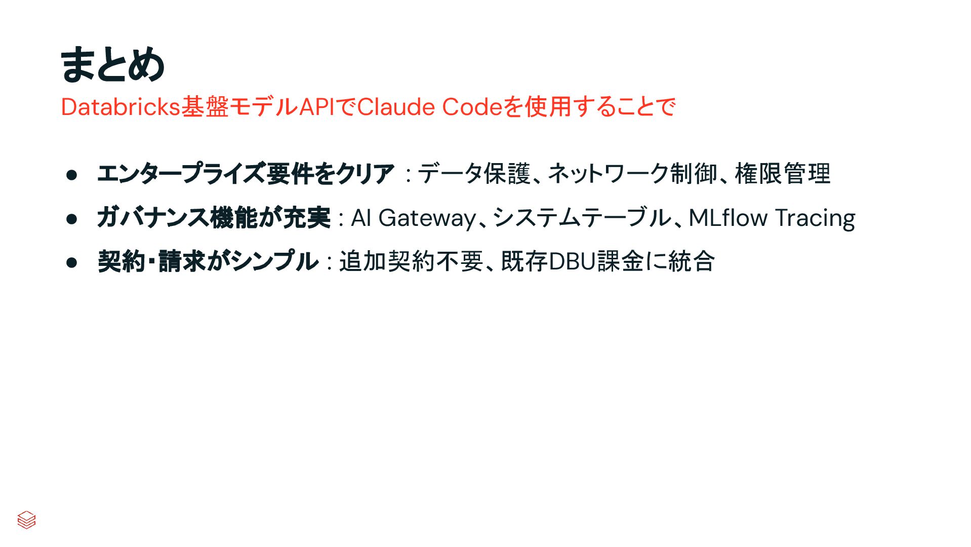 • 契約・請求がシンプル : 追加契約不要、既存DBU課金に統合 まとめ Databricks基盤モデルAPIでClaude Codeを使用することで
