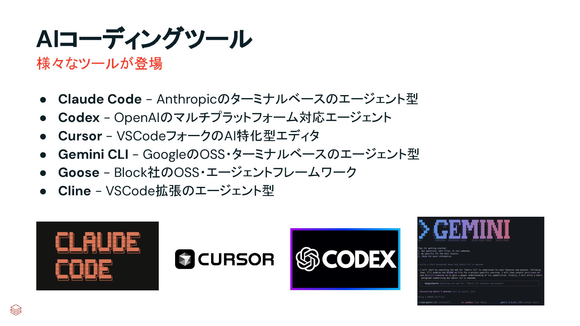 • Cursor - VSCodeフォークのAI特化型エディタ • Gemini CLI - GoogleのOSS・ターミナルベースのエージェント型 • Goose - Block社のOSS・エージェントフレームワーク • Cline - VSCode拡張のエージェント型 様々なツールが登場