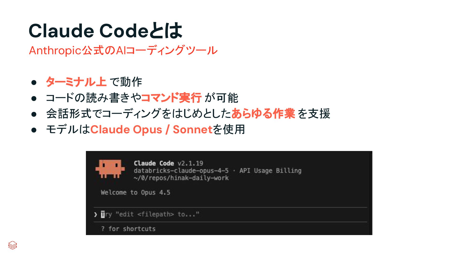 Claude Codeとは • ターミナル上 で動作 • コードの読み書きやコマンド実行 が可能 • 会話形式でコーディングをはじめとしたあらゆる作業