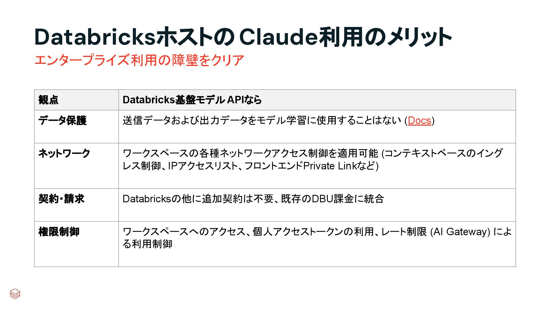 DatabricksホストのClaude利用のメリット エンタープライズ利用の障壁をクリア 観点 Databricks基盤モデル APIなら データ保護 送信データおよび出力データをモデル学習に使用することはない (Docs) ネットワーク ワークスペースの各種ネットワークアクセス制御を適用可能