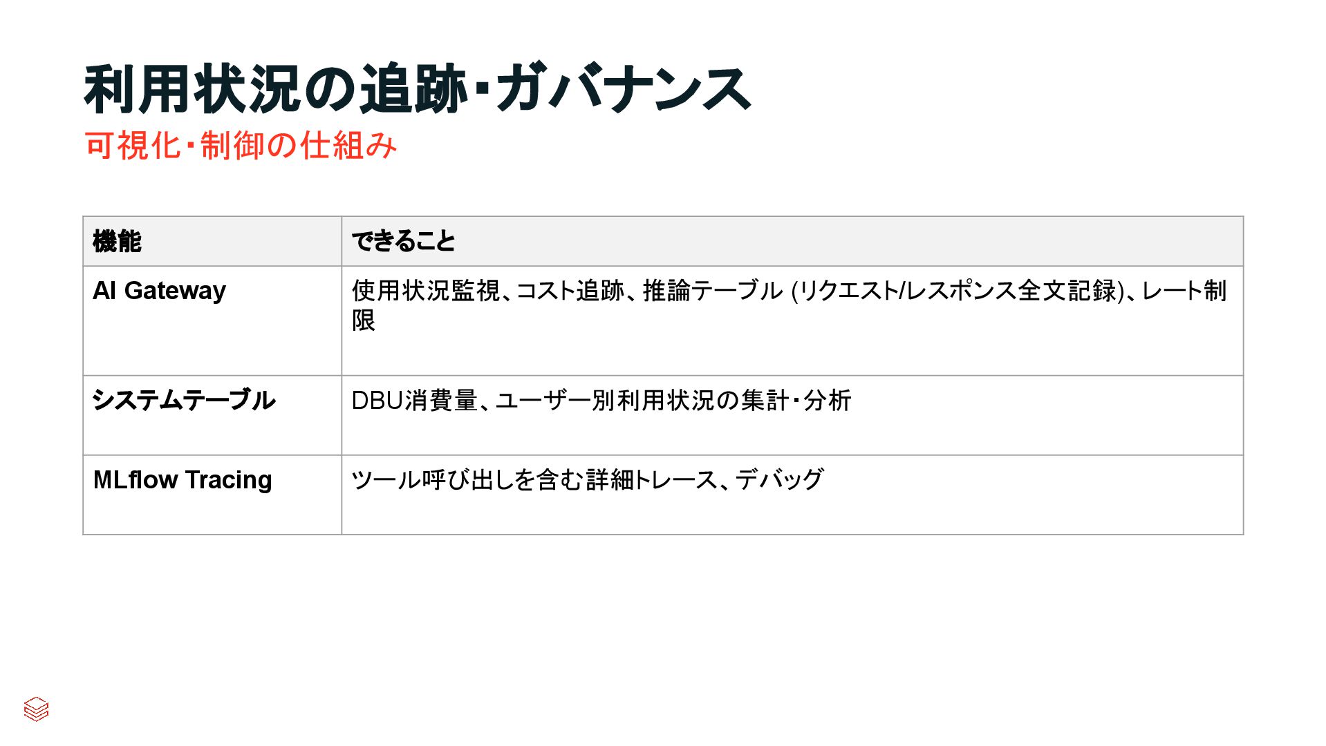 利用状況の追跡・ガバナンス 可視化・制御の仕組み 機能 できること AI Gateway 使用状況監視、コスト追跡、推論テーブル (リクエスト/レスポンス全文記録)、レート制 限 システムテーブル