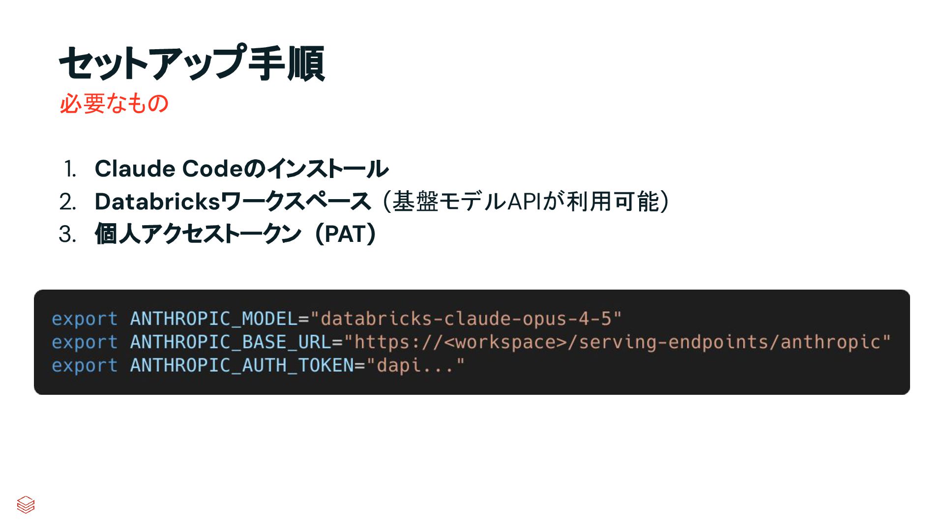 セットアップ手順 1. Claude Codeのインストール 2. Databricksワークスペース (基盤モデルAPIが利用可能) 3. 個人アクセストークン (PAT)