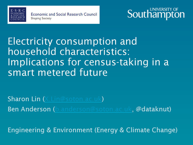 Anderson, B., Lin, X. and Newing, A. (2015) Electricity consumption and household characteristics: Implications for census-taking in a smart metered future. Contributed paper, Royal Statistical Society International Conference 2015, Univesity of Exeter, 9/9/2015 .