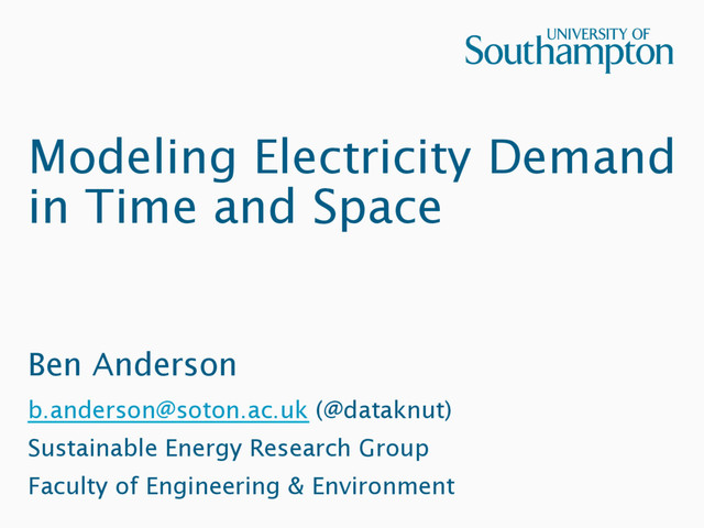 Citation: Anderson, B (2014) Modeling Electricity Demand in Time and Space, Paper presented at ANZRSAI 2014, Christchurch, New Zealand, 2/12/2014
