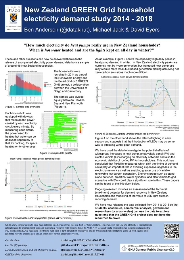 2018 Ben Anderson (@dataknut), Michael Jack & David Eyers These and other questions can now be answered thanks to the release of anonymised electricity power demand data from a sample of around 45 New Zealand households. Figure 4: Seasonal Lighting profiles (mean kW per minute) Figure 3: Seasonal Heat Pump profiles (mean kW per minute) While a few similar datasets have been released in other countries this is a first for New Zealand. Experience in the UK and globally is that releasing datasets leads to unanticipated uses and innovative research with positive benefits. With New Zealand’s rate of smart meter installation leading the way internationally, we need data like this to help train a next generation of analysts and to provoke all stakeholders to come up with secure and equitable ways to create a data-driven smart low-carbon electricity system. The households were recruited in 2014 as part of the Renewable Energy and the Smart Grid (NZ GREEN Grid) project, a collaboration between the Universities of Otago and Canterbury. The sample was divided equally between Hawkes Bay and New Plymouth (Figure 1). Figure 4 on the other hand shows the effect of lighting in each season and suggests that the introduction of LEDs may go some way to offsetting winter peak demand. We have used the data to investigate the potential effects of widespread increases in heat pump, photovoltaic panel (PV) and electric vehicle (EV) charging on electricity networks and also the economic viability of rooftop PV for householders. This work has concluded that flexibility measures which shift the timing of demand could play an important role in avoiding expensive upgrades to the electricity network as well as enabling greater use of variable renewable low-carbon generation. Energy storage such as stand- alone batteries, smart hot water cylinders, and also vehicle-to-grid scenarios with EVs could play a significant role in this. These papers can be found at the link given below. Ongoing research includes an assessment of the technical (maximum) potential for demand response in New Zealand Households and modelling of the value of LED light bulbs in reducing demand. We have now released the data collected from 2014 to 2018 so that students, academics, commercial analysts, government researchers (or anyone else) can use the data to explore questions that the GREEN Grid project does not have the resources to cover. "How much electricity do heat pumps really use in New Zealand households? When is hot water heated and are the lights kept on all day in winter?” Figure 1: Sample size over time Figure 2: Sample data quality Each household was equipped with devices that measure the power carried by each electricity circuit every minute. By monitoring each circuit, the power used for heating hot water can be analysed separately to that for cooking, for space heating or for other uses. As an example, Figure 3 shows the especially high daily peaks in heat pump demand in winter. In New Zealand electricity peaks are currently met by hydro generation, but increased heat pump use may require more fossil-fuel based generation making achieving net zero carbon emissions much more difficult. Get the data: dx.doi.org/10.5255/UKDA-SN-853334 Get the (R) package: github.com/CfSOtago/GREENGridData Data documentation and list of papers to date: cfsotago.github.io/GREENGridData/ GREEN Grid Overview: dx.doi.org/10.1016/j.rser.2017.07.010