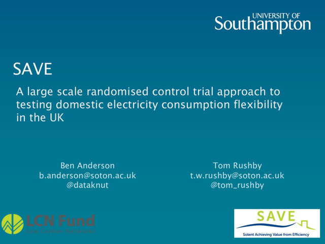 “Whilst overall reduction of energy demand is receiving increasing policy attention in the United Kingdom, reductions targeted at specific times of day are also becoming crucial. This is largely driven by the need to reduce the effects of regular evening demand peaks of increasing magnitude on an ageing local distribution infrastructure; to reduce reliance on ‘high-carbon high-cost’ fuel sources during such demand peaks and to attempt to better match demand to localised, time-specific or intermittent low-carbon generation. This presentation will describe SAVE, a large scale randomised control trial approach to testing a range of interventions intended to reduce and/or shift electricity consumption out of the ‘peak’ 16:00-20:00 evening winter weekday periods. After describing the participant recruitment process and demonstrating the representative and thus generalisable nature of the resulting sample, the presentation will present preliminary results of the first trial period testing different forms of financial and non-financial incentives. It will conclude with a glimpse of ongoing work to use the results to model local area demand profiles which is being continued at the University of Otago in 2018-2019 under an EU funded Marie Skłodowska-Curie Global Fellowship.”