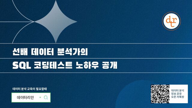 SQL 데이터 분석 캠프 | 패키지 - 데이터리안 캠프 - [강의] 데이터 분석을 위한 기초 SQL - 인프런 - [자료] 데이터 분석을 위한 SQL 참고도서 추천 - 데이터리안 블로그 - [자료] The SQL Tutorial for Data Analysis - mode.com SQL 기초 이론은 코딩 경험이 없는 분들에게도 정말 쉽습니다. 일단 시작하세요! SQL 코딩테스트 준비 시작하기 SQL 데이터 분석 캠프
